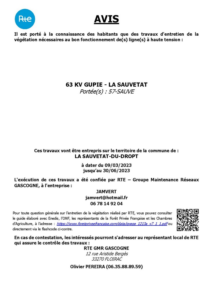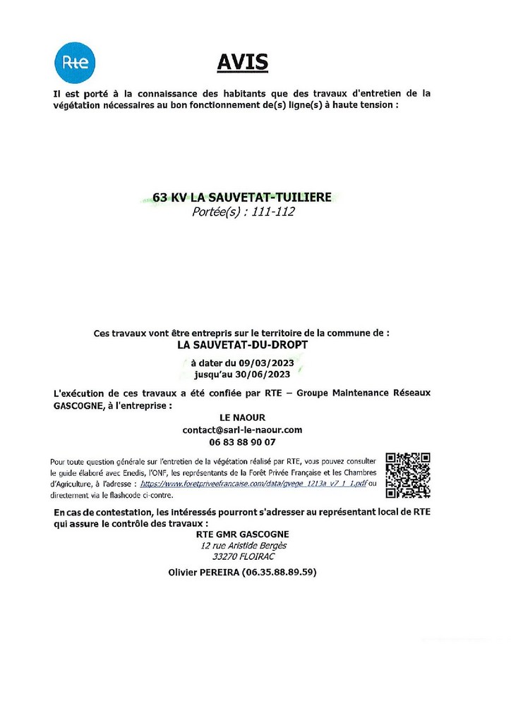 La mairie vous informe que des travaux d’entretien de la végétation nécessaires au bon fonctionnement de la ligne haute tension auront lieu sur la commune de La Sauvetat du Dropt du 9 mars au 30 juin 2023. Merci de consulter les documents ci-dessous pour prendre connaissance des lieux exacts.