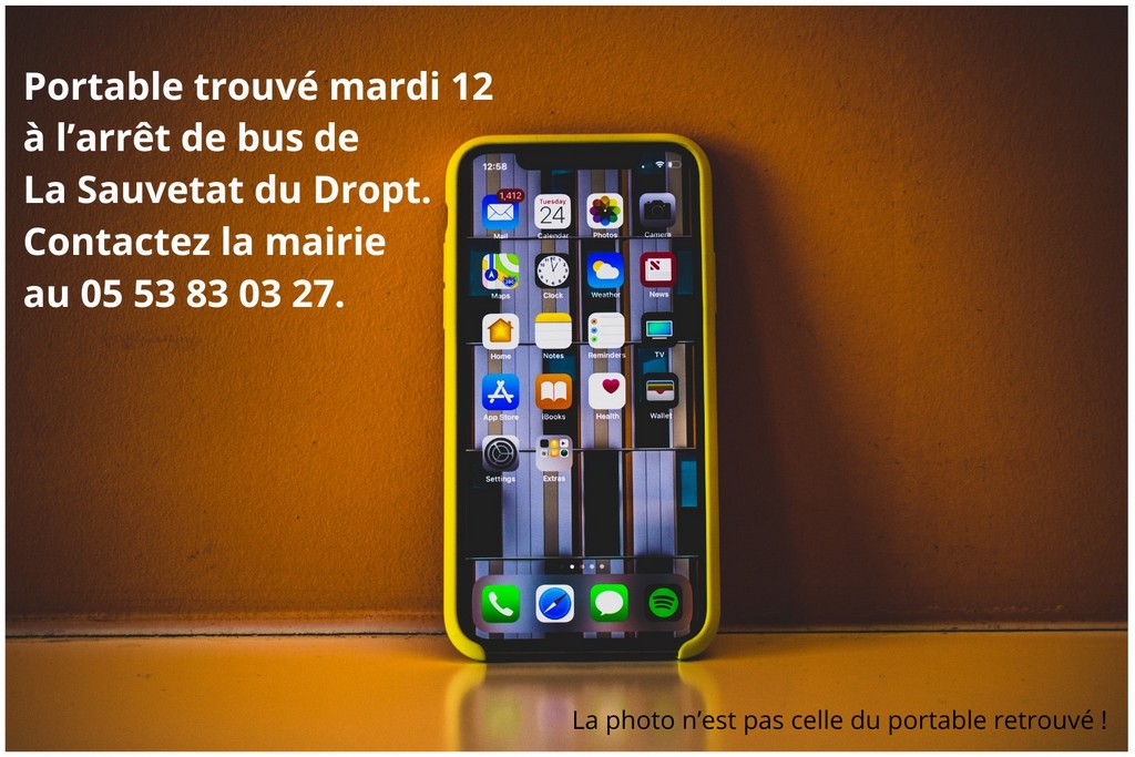 Cette semaine, ont été ramenés à la mairie un portable trouvé mardi matin à l’arrêt de bus et un trousseau de clés trouvé jeudi Avenue du Pied. Contactez la mairie si l’un de ces objets vous appartient. Il faudra donner la marque et la couleur du portable pour prouver l’appartenance.