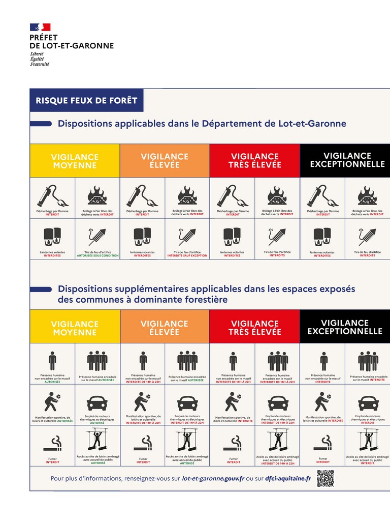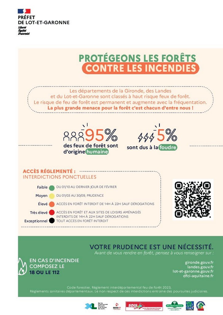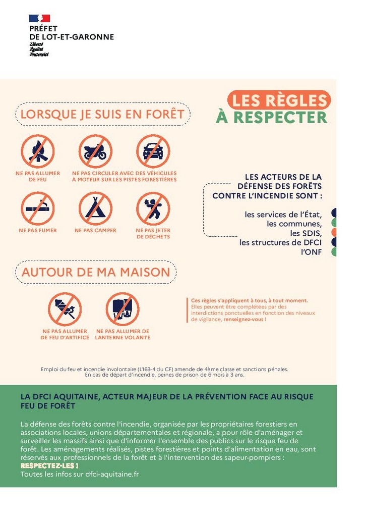 La Préfecture du Lot-et-Garonne informe sur le risque des feux de forêts dans les départements des Landes, de la Gironde mais aussi du Lot-et-Garonne. Notre commune de La Sauvetat du Dropt est concernée. Merci de consulter le document ci-dessous et de lire attentivement les informations données.