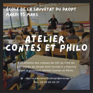 Parents du RPI Vallée du Dropt, la Mairie vous informe que le prochain Atelier Contes et Philo est programmé pour le mardi 15 mars à 18h dans la classe de La Sauvetat du Dropt. Un courrier sera donné aux enfants des classes de CE1 au CM2 dans la semaine qui précède mais vous pouvez déjà les inscrire auprès du secrétariat de Mairie.