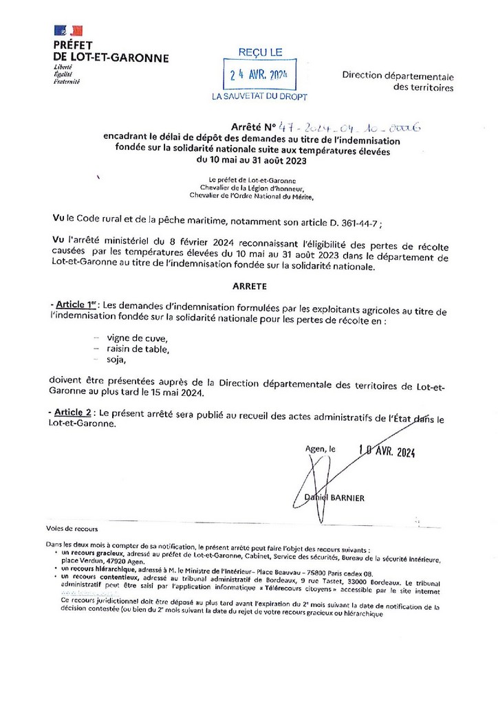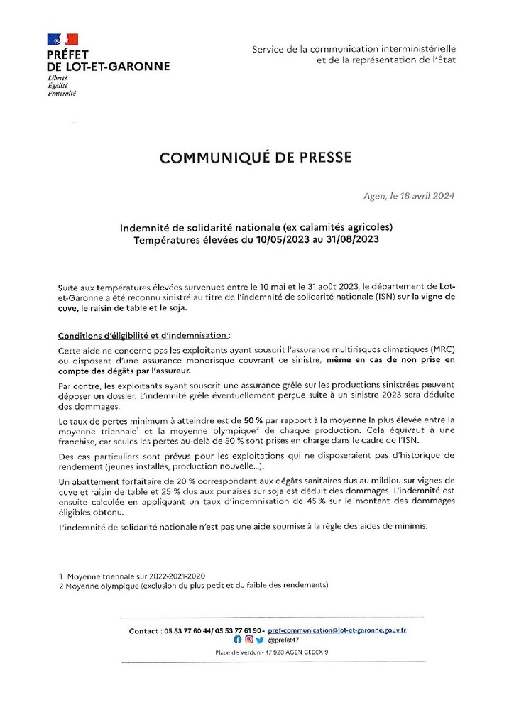 Suite aux températures élevées survenues entre le 10 mai et le 31 août 2023, le département du Lot-et-Garonne a été reconnu sinistré au titre de l’Indemnité de Solidarité Nationale (INS, ex calamités agricoles) sur la vigne de cuve, le raisin de table et le soja.