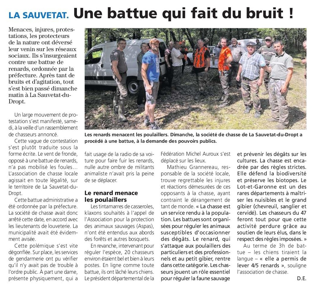 Malgré de nombreuses menaces reçues par le Maire et le président de la société de chasse ainsi que largement diffusées sur les réseaux sociaux, la battue au renard organisée par la Société du Chasseur Sauvetatois dimanche 24 mai s’est correctement déroulée avec le soutien et l’accord des instances départementales, à savoir Jean-Luc Gardeau, Maire, la Préfecture, la DDT ainsi que la Fédération des Chasseurs du Lot-et-Garonne.