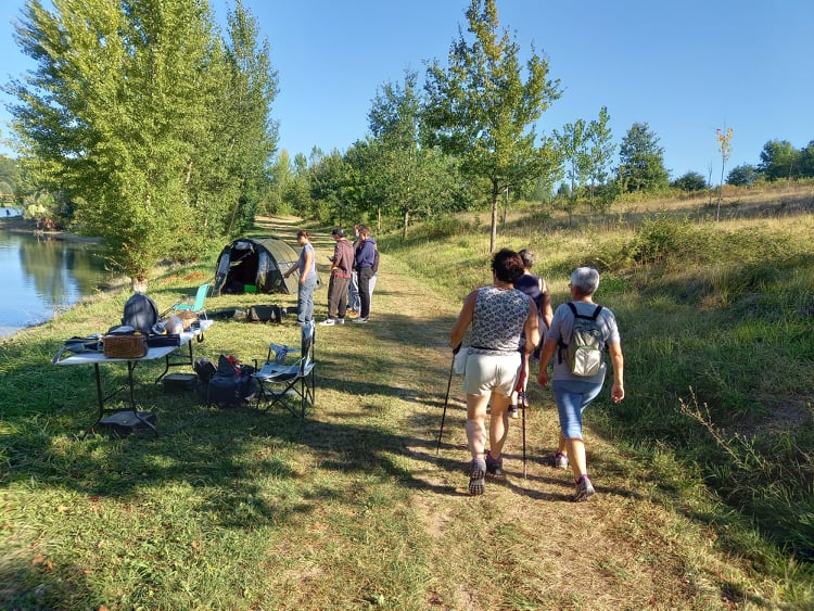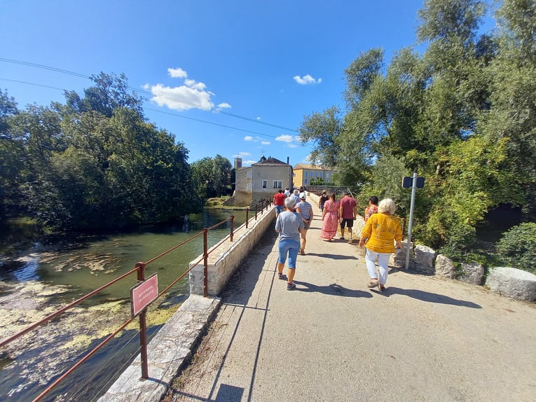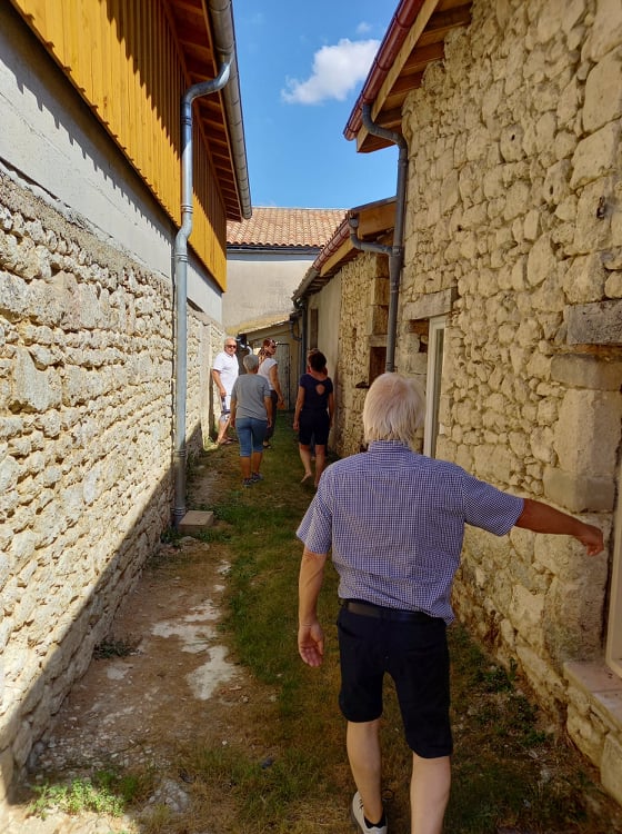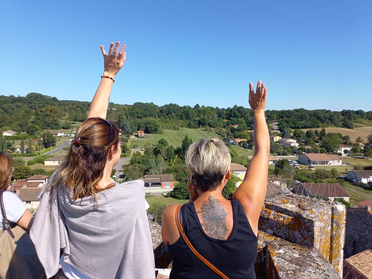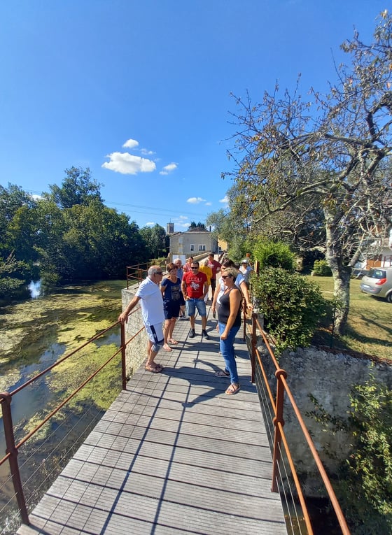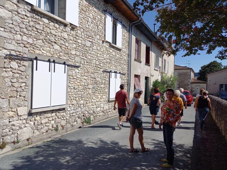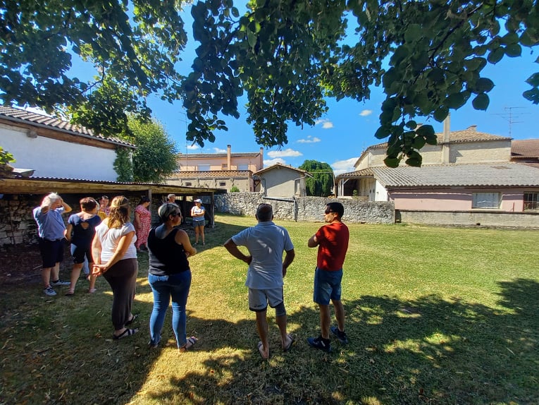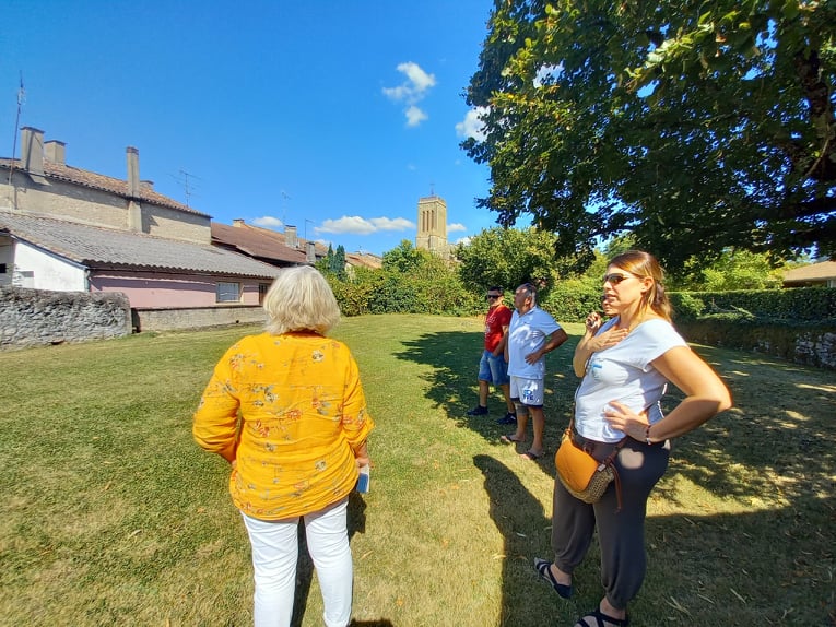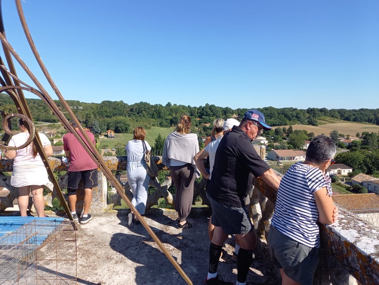 La matinée, fraîche mais très ensoleillée, commençait par une agréable randonnée autour du Lac de l’Escourou. Dans le groupe, Tati Sauvette qui, même sans son costume de scène, n’a pas oublié de remplir une poche de déchets glanés le long du parcours. Suivie la découverte du village, et pour certains de leur maison, depuis le haut du clocher où l’on monte avec prudence et contorsions ! Rassemblement ensuite sur la Prairie des Croquants pour l’apéritif et un repas paëlla avant de poursuivre la journée par un mini circuit allant du pont roman aux rues et ruelles. Un arrêt plus prolongé dans l’espace autour des maisons Brugère récemment acquises par le biais de l’Établissement Public Foncier (EPF) permit à Monsieur le Maire de développer l’objectif municipal de création d’un habitat partagé de type béguinage. Un habitat adapté aux seniors qui pourront apprécier le bien vivre ensemble tout en gardant leur autonomie dans un appartement indépendant.