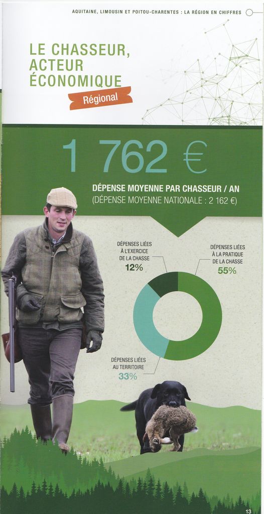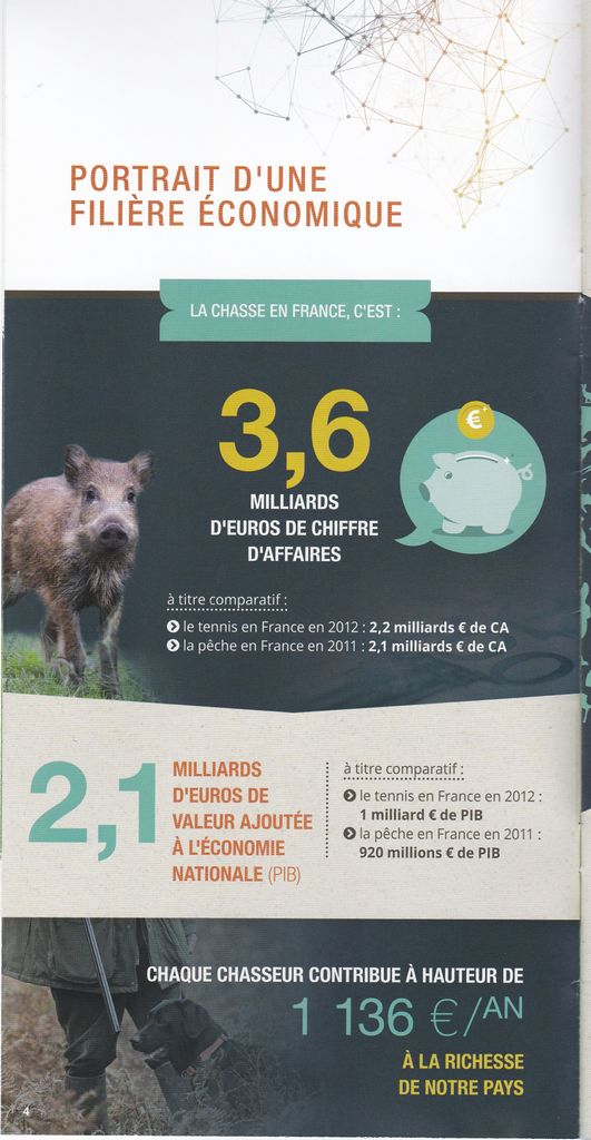 Mais profitons de cette occasion pour vous faire part d’une étude menée en 2015 pour la Fédération Nationale des Chasseurs. Cette analyse démontre que la chasse a un réel poids économique, social et environnemental. Et que « le chemin du développement durable passe plus que jamais par la voie de la filière chasse ». Conclusion de Bernard Baudin, Président de la Fédération Nationale des Chasseurs.