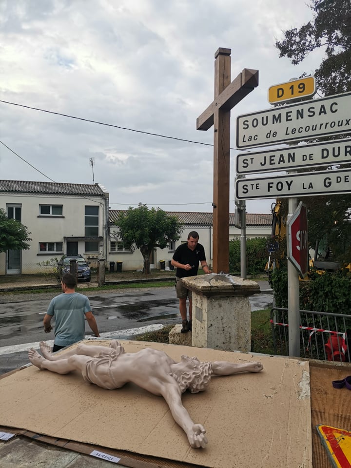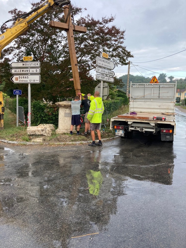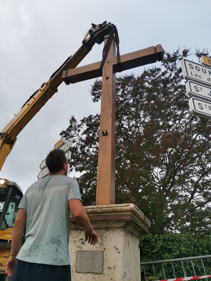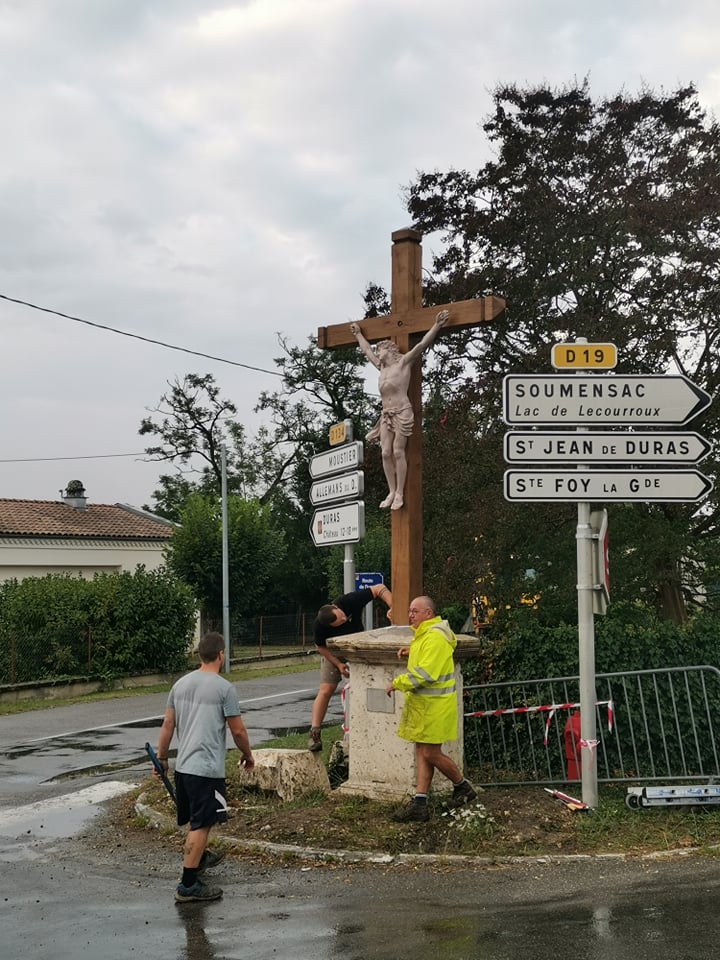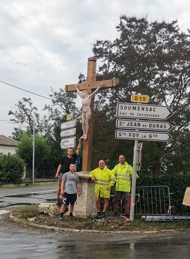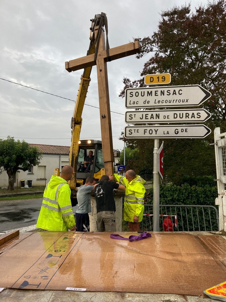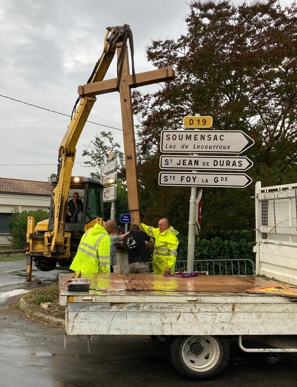 C’est mercredi 15 septembre, par une matinée pluvieuse, que les employés municipaux Jean-Marc et Aurélien, Monsieur le Maire Jean-Luc Gardeau dans son tracto-pelle et les charpentiers Ian et Thomas Janssen se rendaient au carrefour de Duras – Ste-Foy-la-Grande pour remonter la croix nouvellement taillée et y fixer son Christ. Travail effectué sous l’œil avisé du conseiller Jean-Robert Garoste qui prenait des photos pour cet événement.