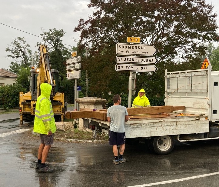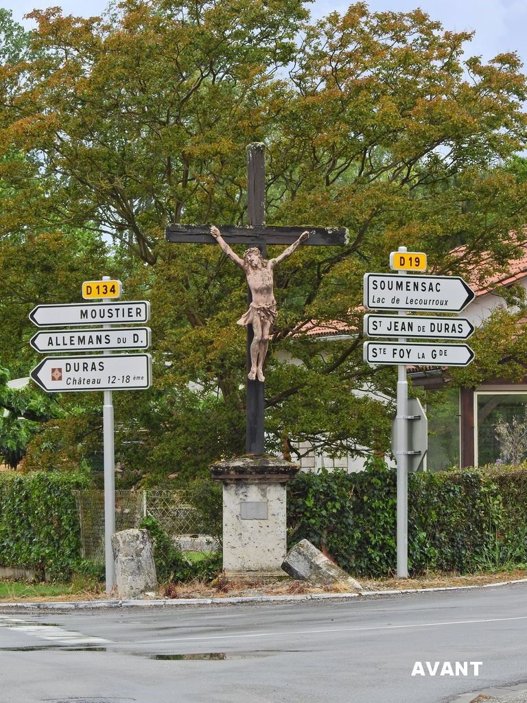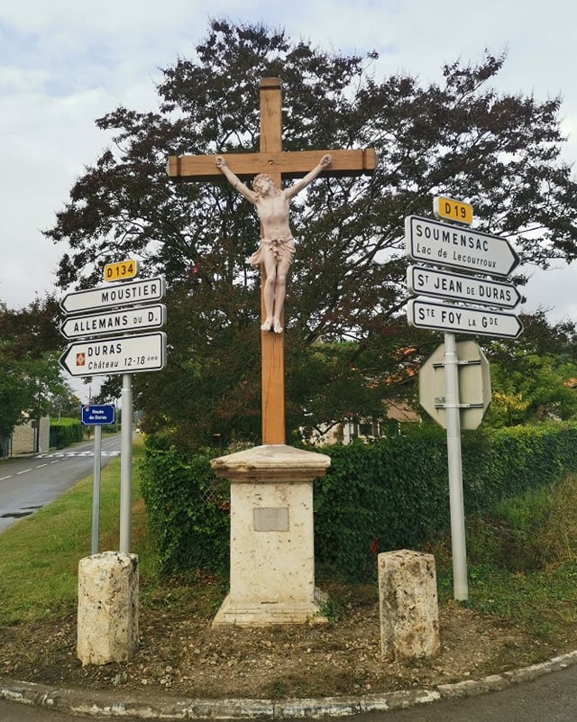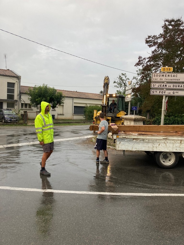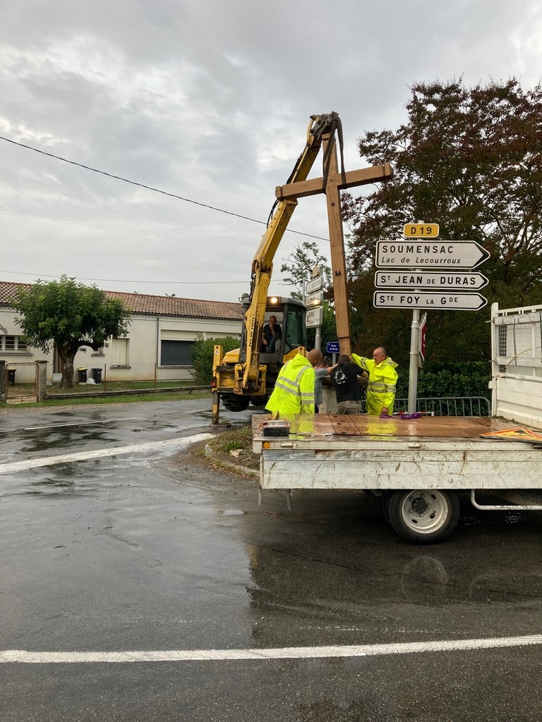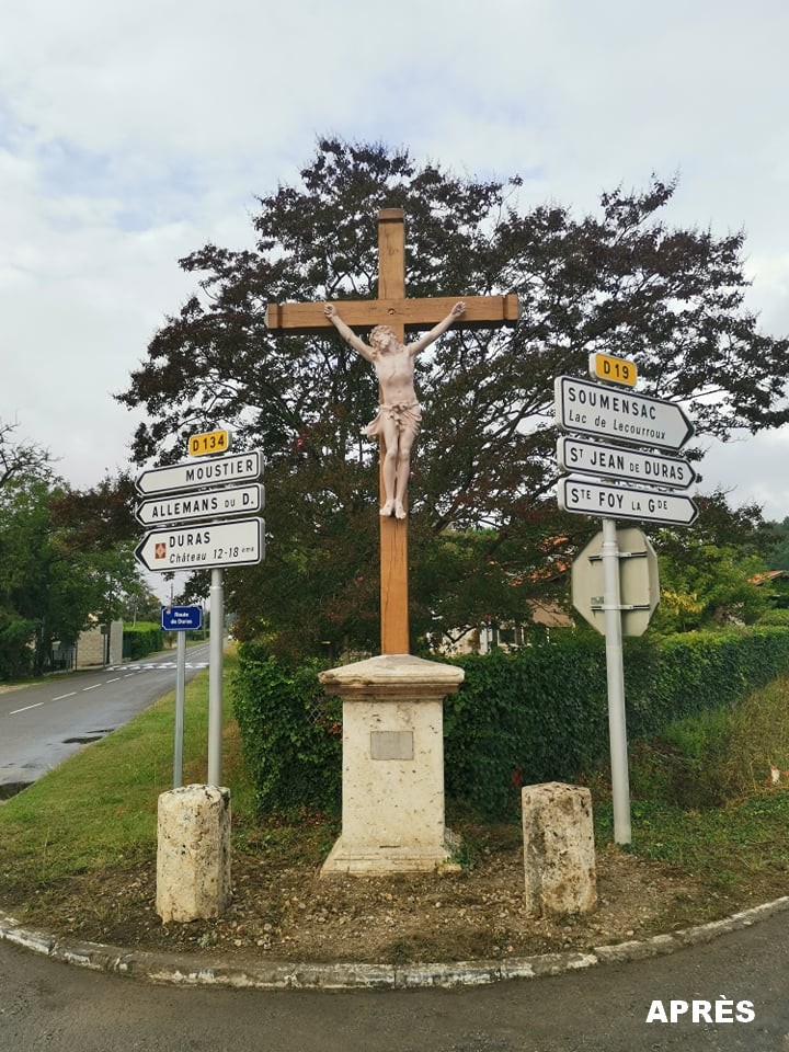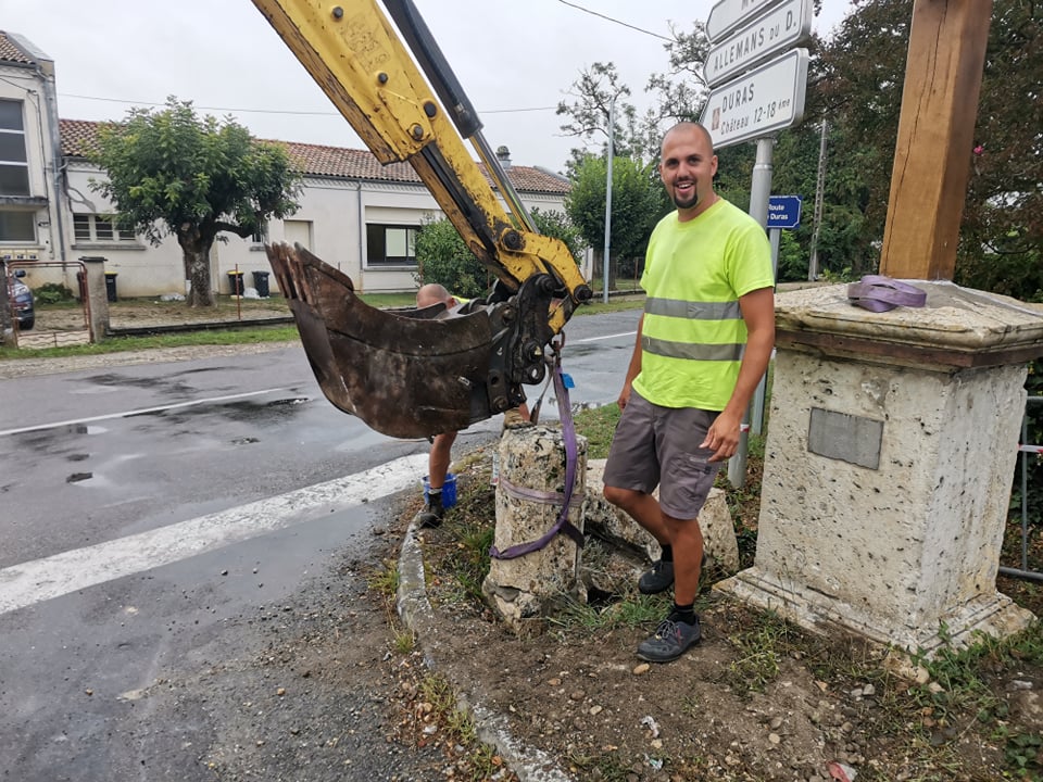 C’est mercredi 15 septembre, par une matinée pluvieuse, que les employés municipaux Jean-Marc et Aurélien, Monsieur le Maire Jean-Luc Gardeau dans son tracto-pelle et les charpentiers Ian et Thomas Janssen se rendaient au carrefour de Duras – Ste-Foy-la-Grande pour remonter la croix nouvellement taillée et y fixer son Christ. Travail effectué sous l’œil avisé du conseiller Jean-Robert Garoste qui prenait des photos pour cet événement.