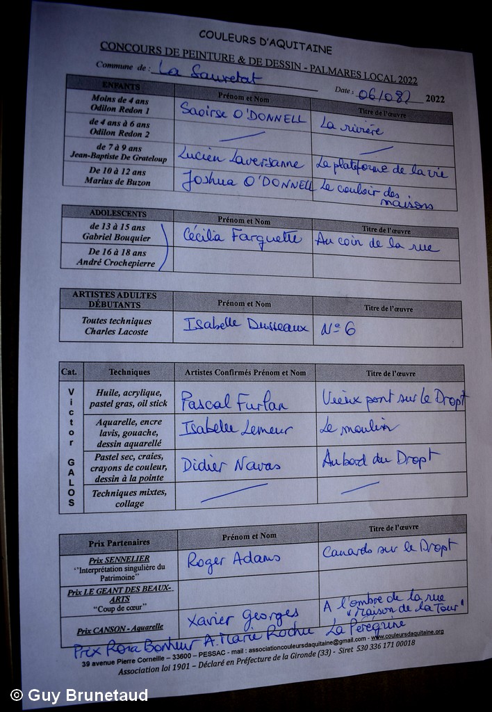 Le samedi, la journée commençait par le Concours de Peinture de l’association Couleurs d’Aquitaine reçue par les Amis de la Sauveté et son président Jacques Foglia. Belle participation de 25 peintres amateurs ou semi professionnels dont 13 enfants. Dessins et peintures étaient exposées en milieu d’après-midi avant d’être examinés par un jury composé de Jean-Luc Gardeau, Maire du village, et de trois sauvetatois. Ian Graham photographe, Audrey Chabert peintre et Odette Foglia, épouse du président des Amis de la Sauveté.