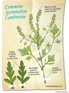 Pour rappel : l’ambroisie est une plante invasive dont le pollen provoque de graves allergies pouvant mener jusqu’à l’asthme (50% des cas).