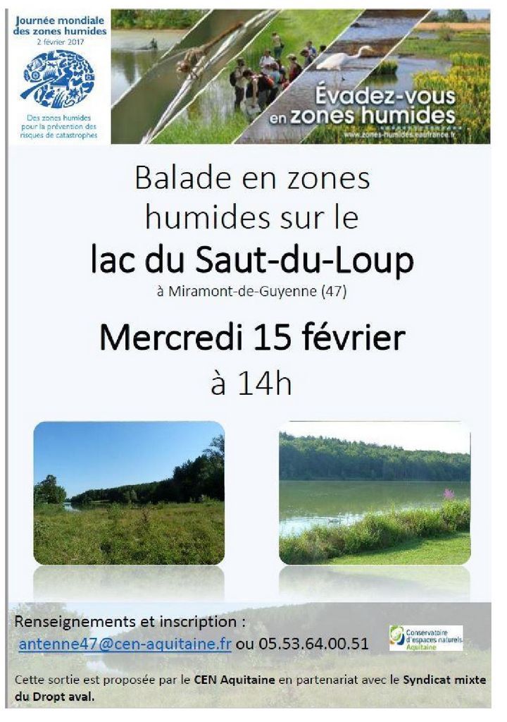 Dans le cadre de la Journée Mondiale des Zones Humides, le Conservatoire d’Espaces Naturels d’Aquitaine avec Julie, et le syndicat mixte du Dropt avec Alexandre ont organisé une balade commentée autour du Lac du Saut du Loup à Miramont de Guyenne.