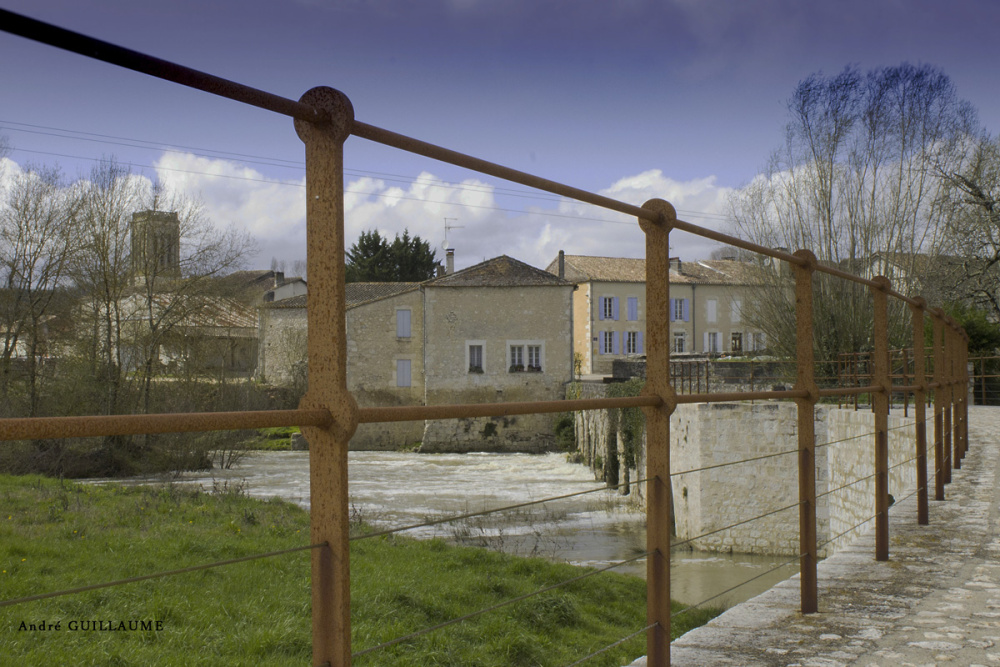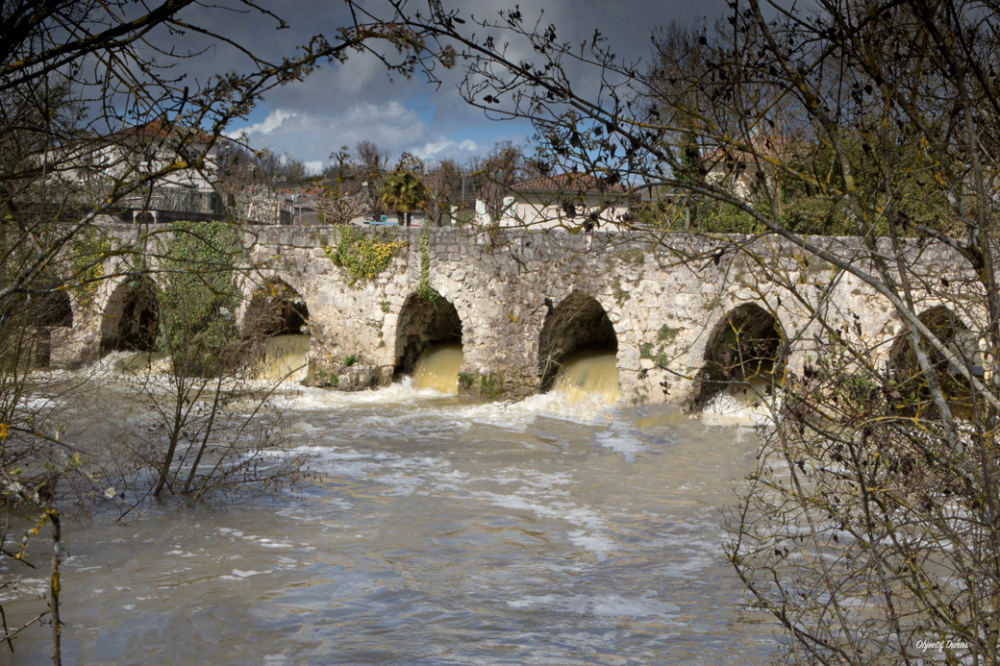 Place aux photos: le Pont Roman et sa partie romane maintenant restaurée, la croix des pèlerins, beaucoup d’eau sous les arches de la partie gothique du pont et incitation à la flânerie sur le beau sentier de verdure qui relie l’aire de camping-car à la Place du Moulin…