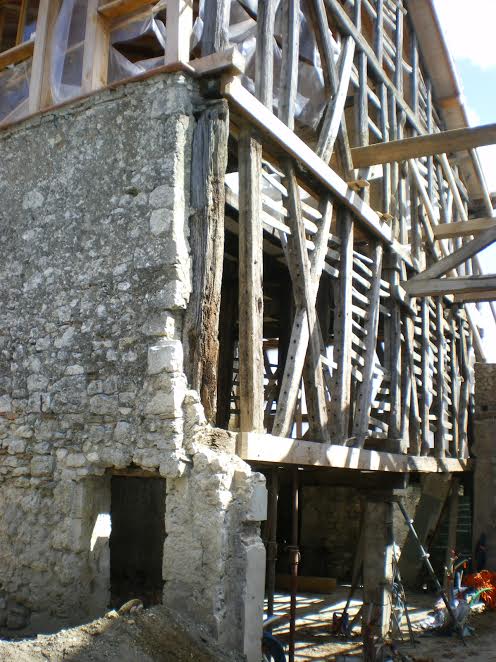 Le remplissage des pans de bois est fait de torchis (argile, paille, chaux et sable). Les bois sont courts – leur longueur représente généralement un niveau – et on remarque des croix de St André (en X) qui égaient la façade. Les historiens racontent qu’au moyen-âge, le torchis était peint de couleurs vives et que ces couleurs différaient d’une maison à une autre.