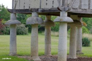 « Le pigeonnier repose sur neuf colonnes de pierre dont le haut est terminé en forme de champignon pour éviter l’atteinte des rongeurs. Des poutres de bois mêlées de briques constituent le corps principal de la construction. La toiture à quatre pans, couverte en tuiles plates, repose sur des consoles en bois découpé. »