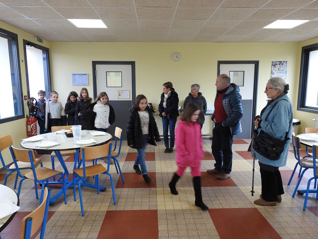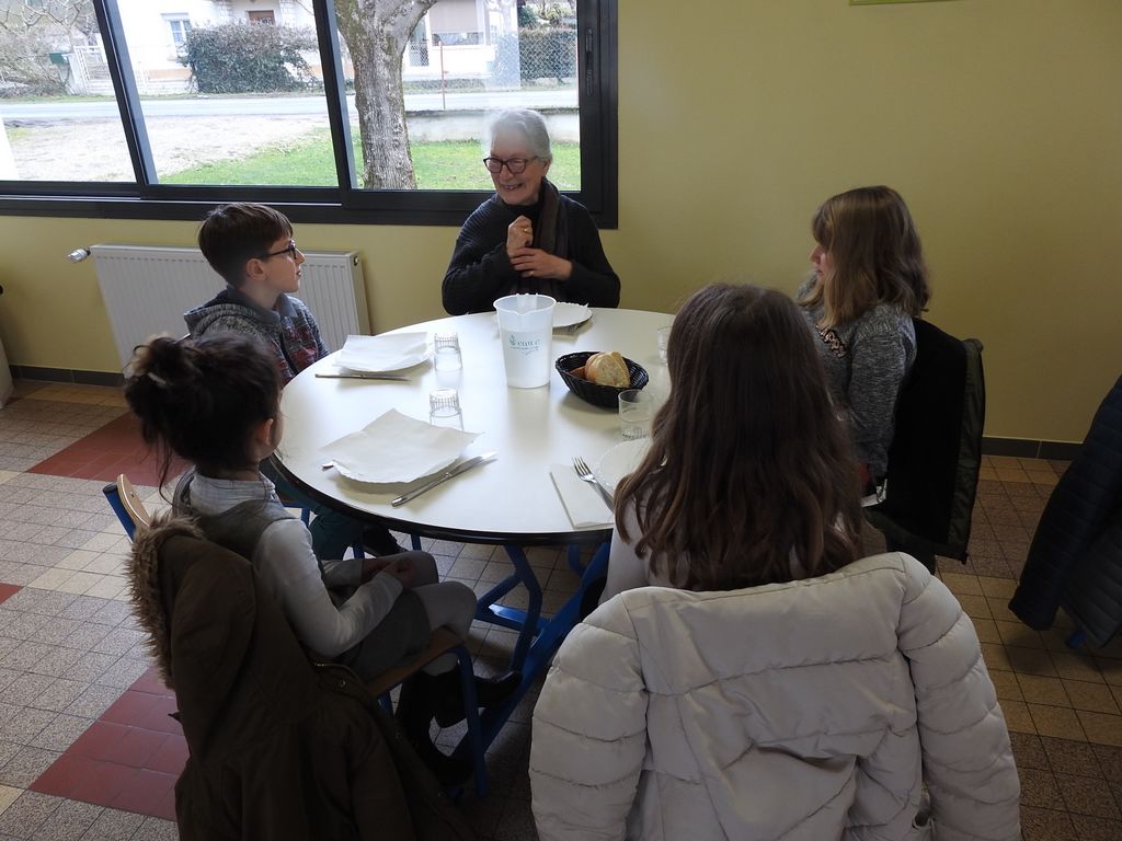 Francine avait à sa table 3 garçons et 1 fille dont elle ne se rappelle pas encore les prénoms. Voilà un bon exercice pour la mémoire, n’est-ce pas? Ils ont tous beaucoup parlé et souvent en même temps. Elle a eu un peu de mal à les comprendre. Ils ont été très polis puisqu’un de ces enfants l’a servie. Ils ont parlé des cadeaux de Noël et Francine leur a raconté le temps, il y a longtemps, où elle allait à l’école de La Sauvetat. Qu’il n’y avait pas de cantine et qu’elle n’y mangeait que quand il faisait mauvais temps. Sa maman lui préparait alors une omelette entre 2 morceaux de pain et une petite bouteille d’eau. Elle adorait ça et surtout de rester manger avec les copains et les copines. Elle leur a aussi expliqué qu’autrefois, l’école était dans le bâtiment de la mairie actuellement et que ce pique-nique se prenait dans le couloir où étaient installés des tables et des bancs. Pour elle, c’était la fête.