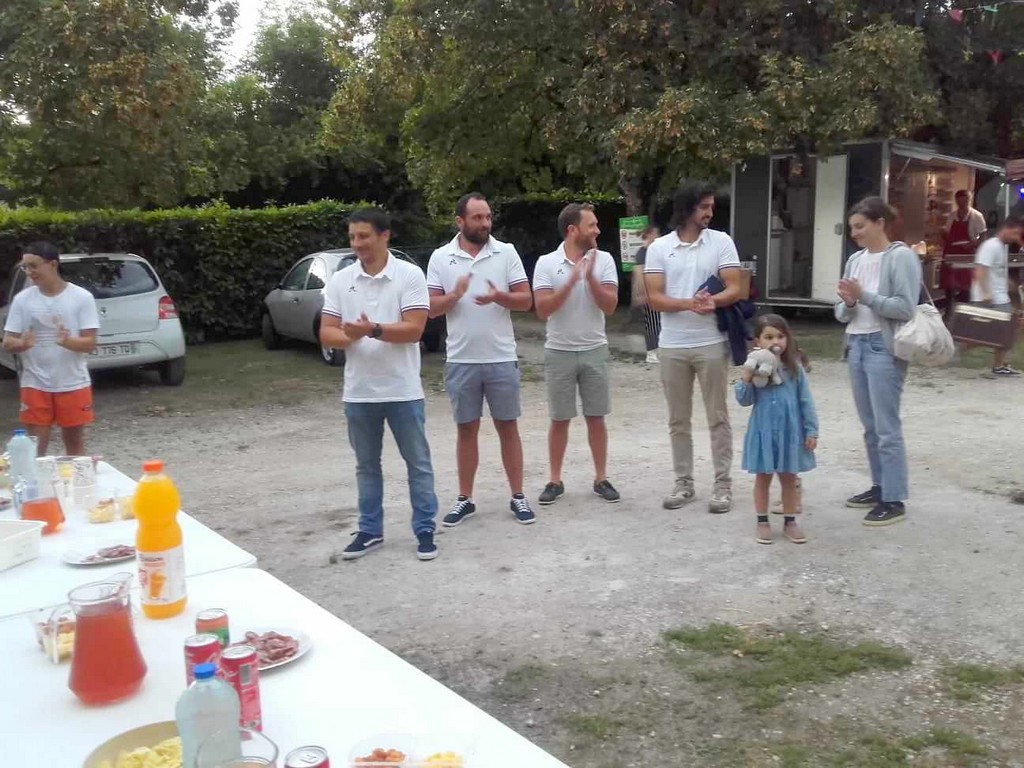 C’est vendredi 7 juillet, au cours de la première des Soirées Gourmandes, qu’un petit comité composé des Maires de La Sauvetat du Dropt et d’Allemans du Dropt, du président du Comité des Fêtes Peter Cain ainsi que des fidèles supporters du Canoë Kayak Club Vallée du Dropt se sont retrouvés pour féliciter les 4 athlètes de l’Équipe de France ayant participé au Championnat du Monde de Rafting qui avait lieu fin juin, débit juillet à Sondrio en Italie.