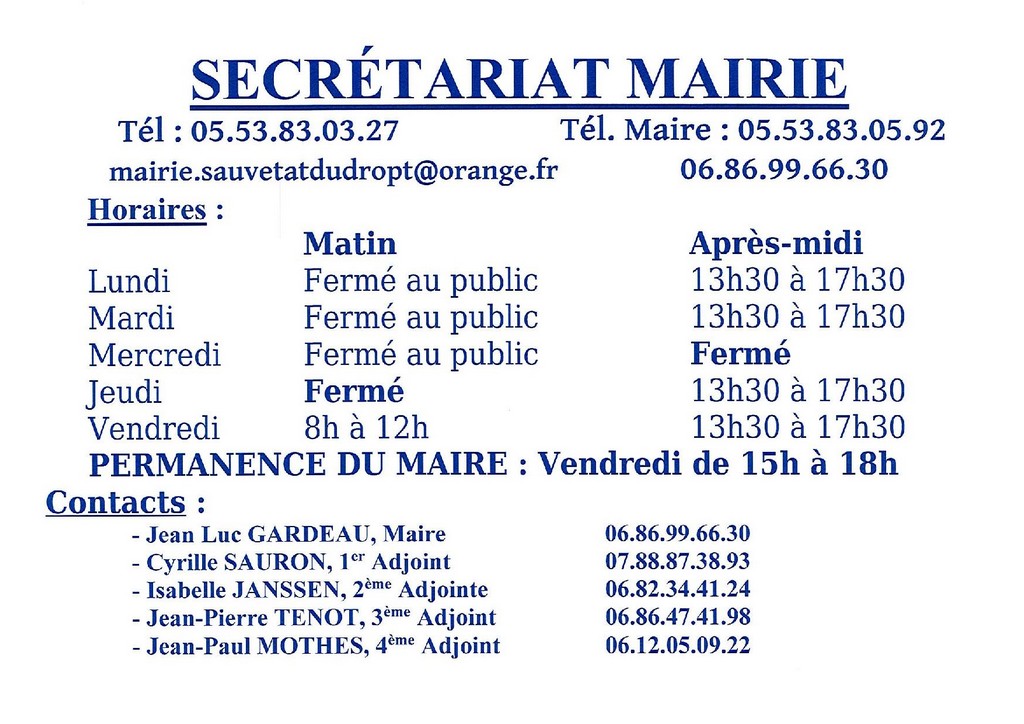 Renseignements à la mairie au 05.53.83.03.27 ou mairie.sauvetatdudropt@orange.fr