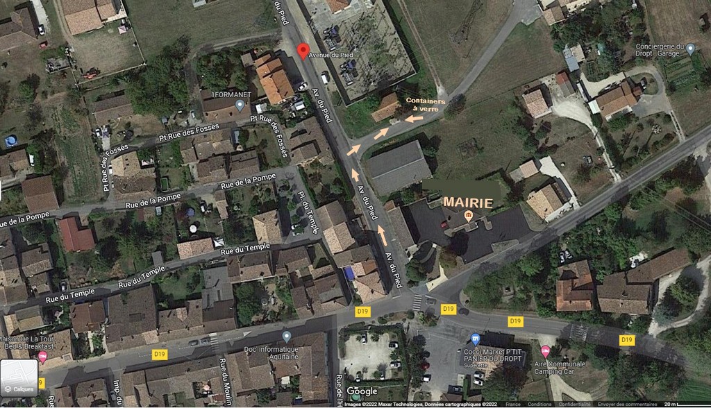 A La Sauvetat du Dropt, vous trouverez deux containers à verre Avenue du Pied, sur la droite, contre un vieux séchoir à tabac.