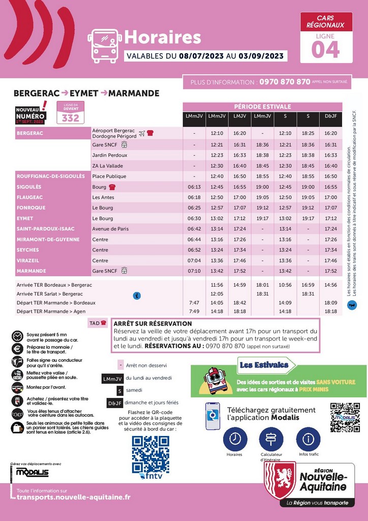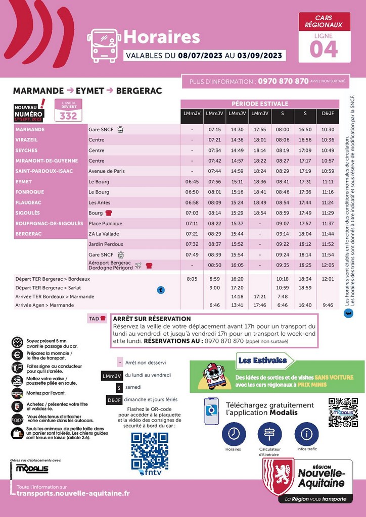 N’oubliez pas que notre territoire est desservi par les lignes régionales des bus de Dordogne. Vous avez la possibilité de vous déplacer en utilisant la Ligne 332 Bergerac-Eymet-Marmande avec des arrêts à St Pardoux-Isaac et Miramont de Guyenne.