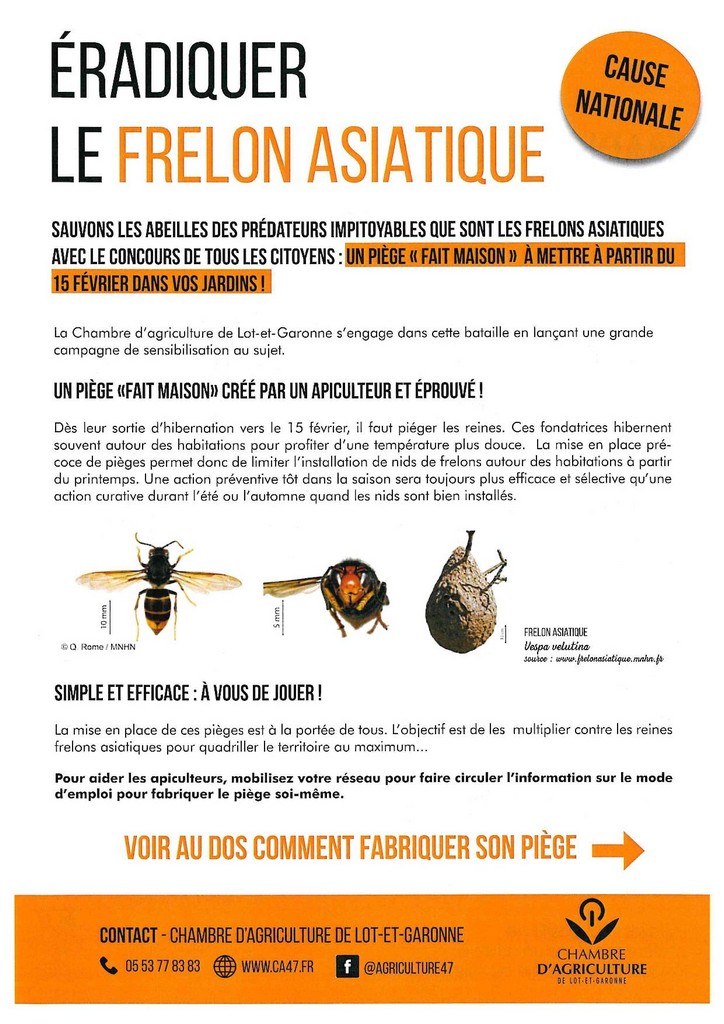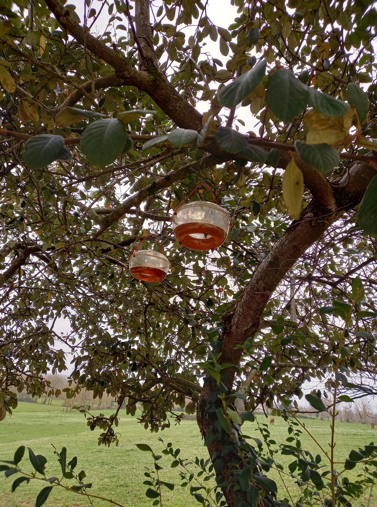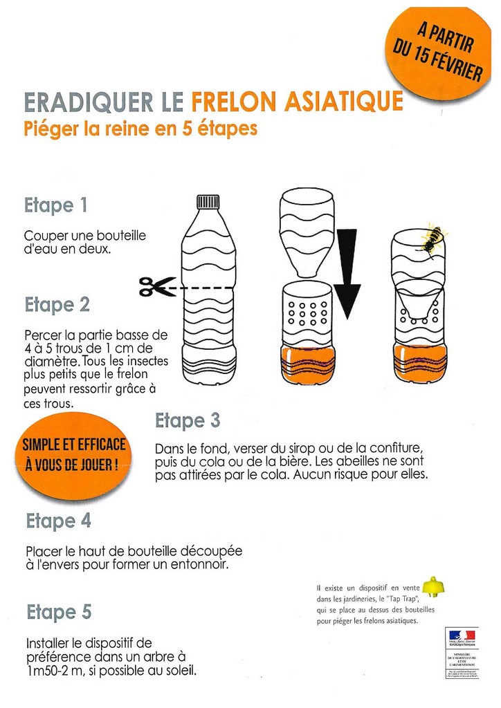 Une fidèle lectrice nous envoie les photos des pièges à frelons asiatiques qu’elle vient de poser dans son jardin. La recette de sa préparation : 1/3 de vin blanc, 1/3 de bière et 1/3 de sirop de fraise. Elle explique que le vin blanc repousse les abeilles.