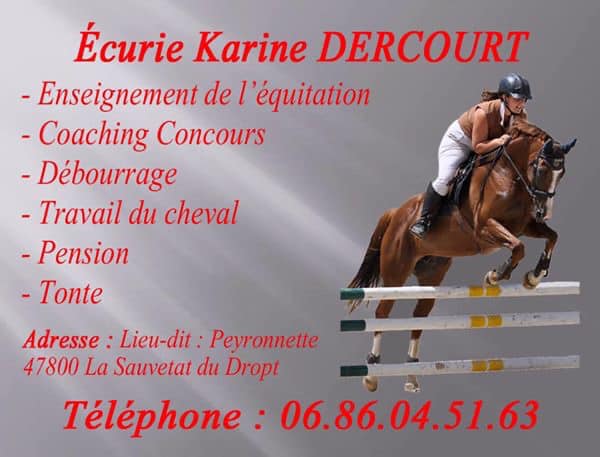 L’écurie Karine DERCOURT se situe en Lot et Garonne , à la SAUVETAT DU DROPT (47).