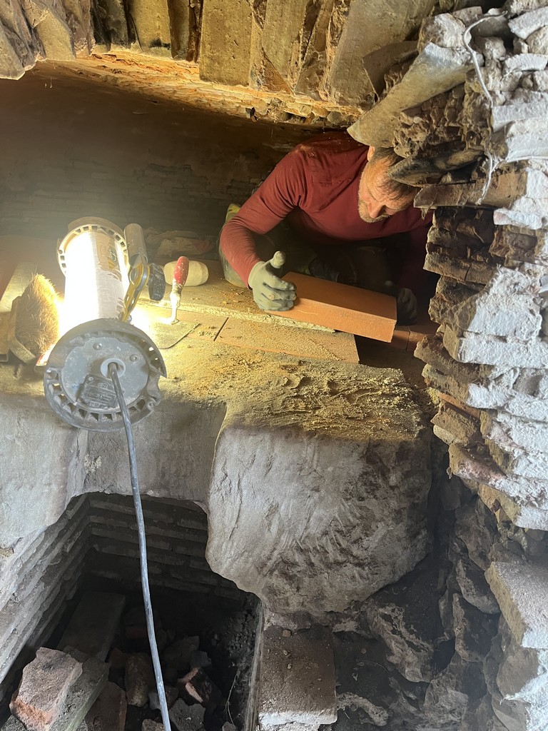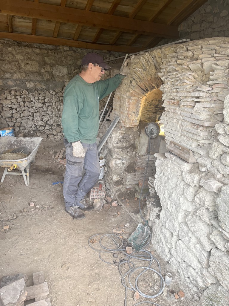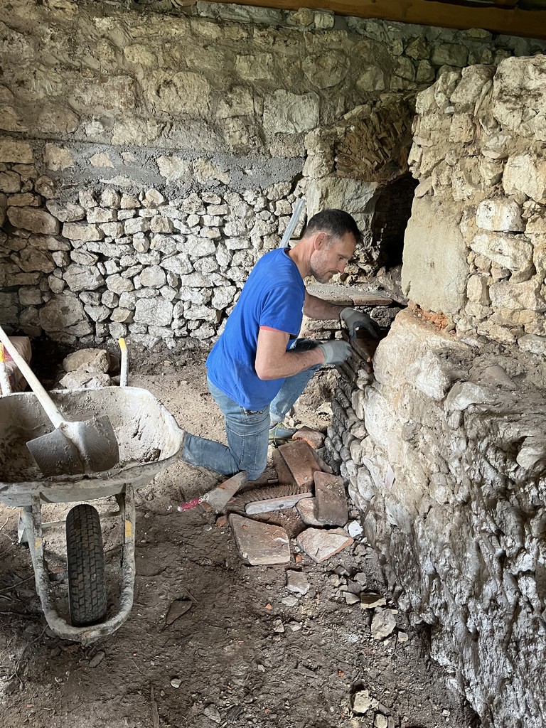 Après deux samedis de déblaiement du bâtiment abritant les fours à pain situés dans l’enceinte de l’Habitat Partagé Seniors, ont débuté les travaux de réfection de ces joyaux du passé. Grâce à l’aide de Gérald, ancien coéquipier de foot et ami de Monsieur le Maire Jean-Luc Gardeau, le seuil de l’un des fours est maintenant refait et la voûte resuivie.