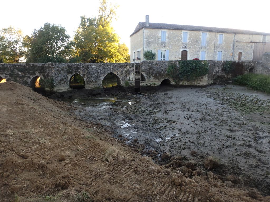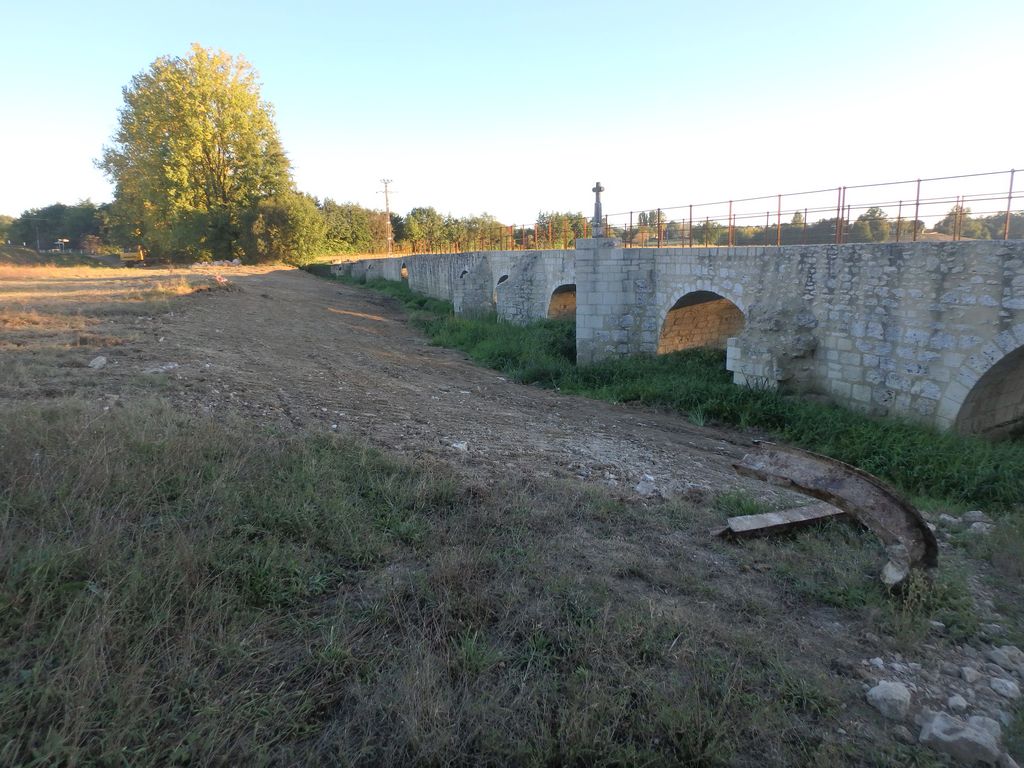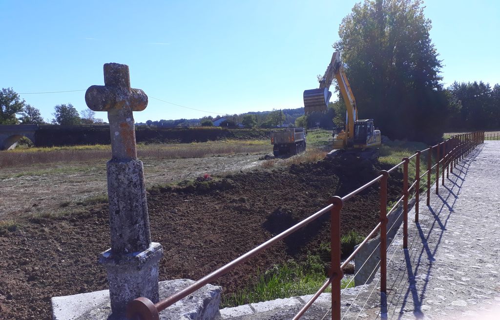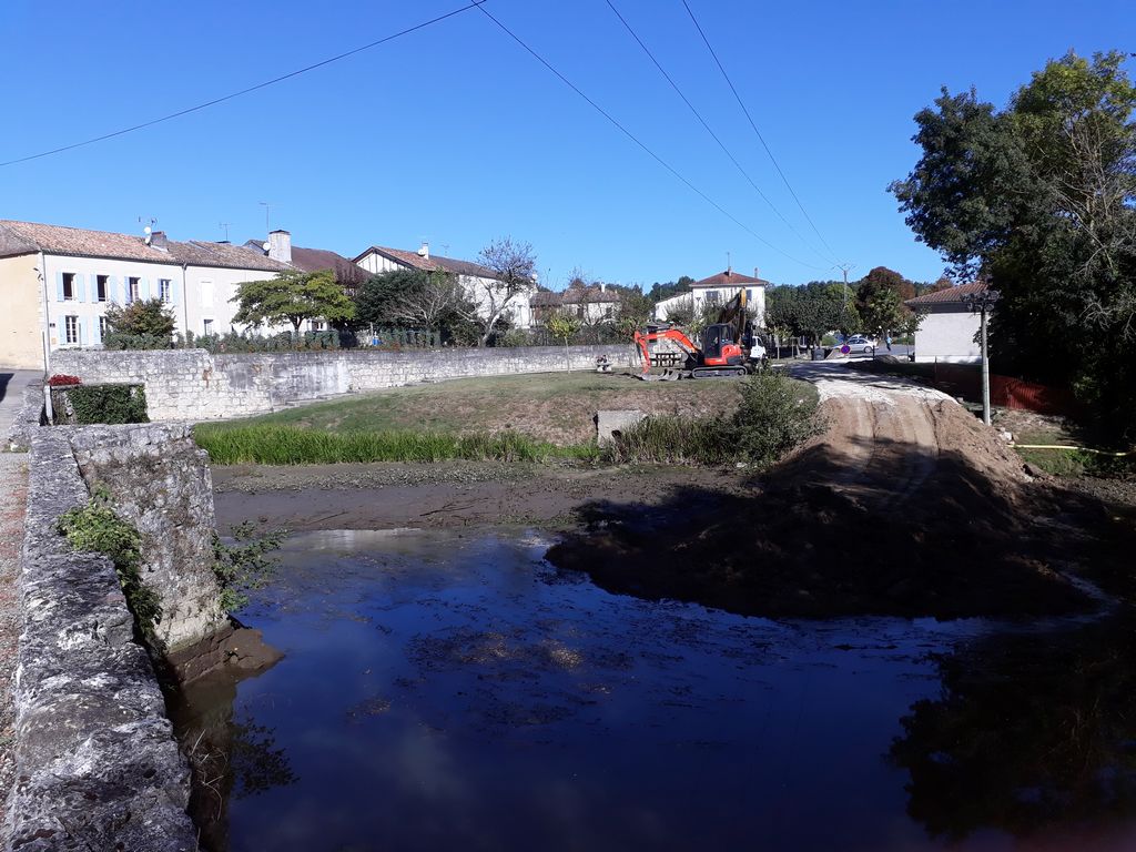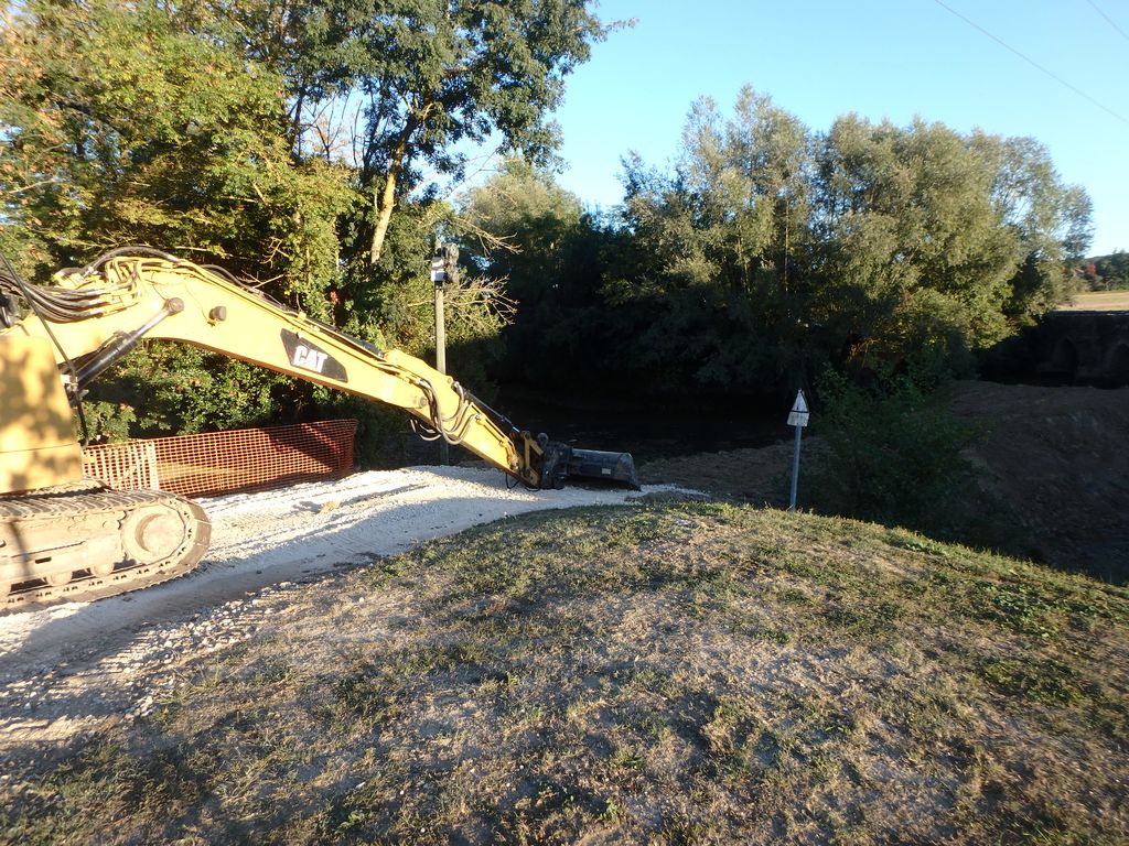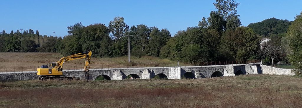 Pour accéder du mieux possible à l’édifice, un batardeau en terre vient d’être construit par l’Entreprise Estardier depuis la Place du Moulin nécessitant au préalable la création d’un chemin sur l’aire de pique-nique. La terre nécessaire à la construction du batardeau a été sortie côté amont des arches déjà restaurées. Cette décision aura permis également de dégager la vue sur cette partie romane du pont.
