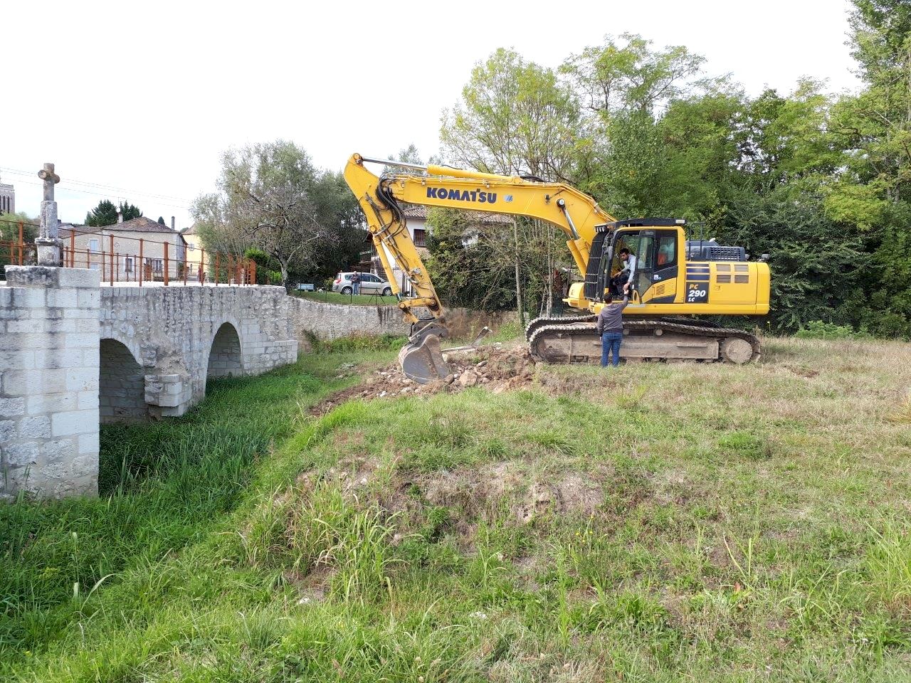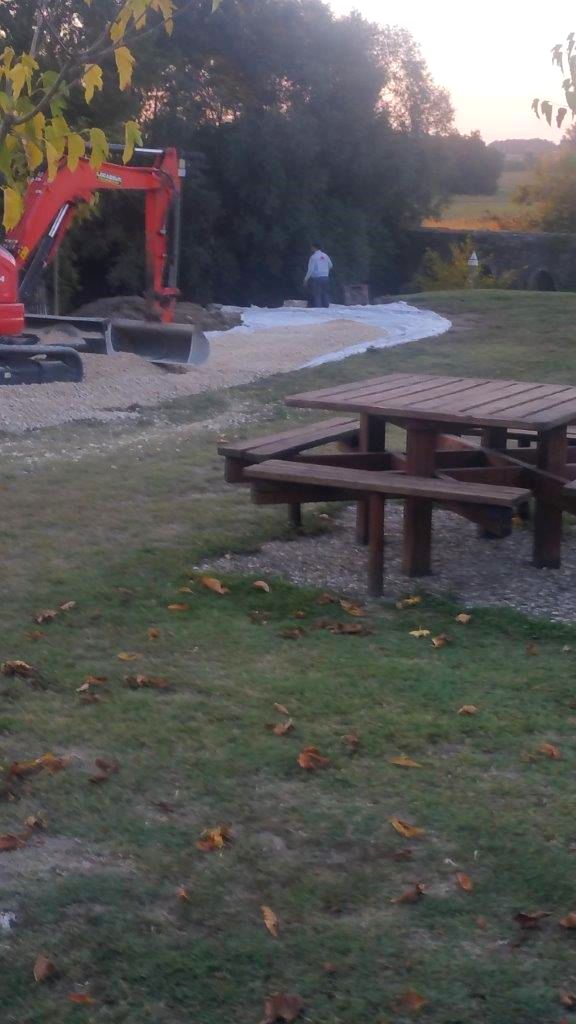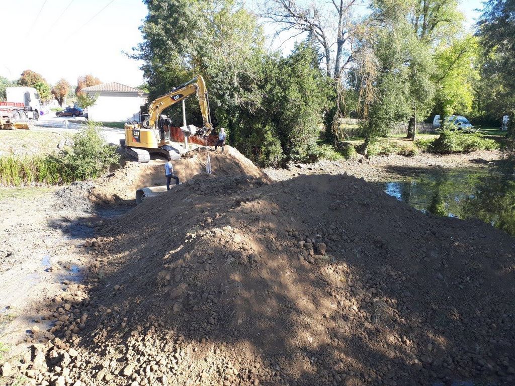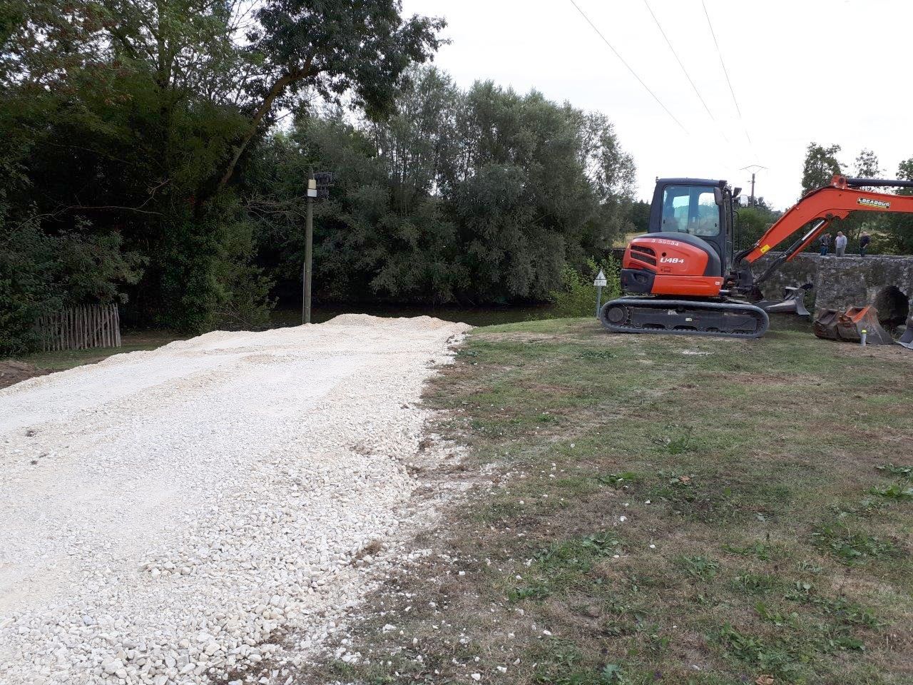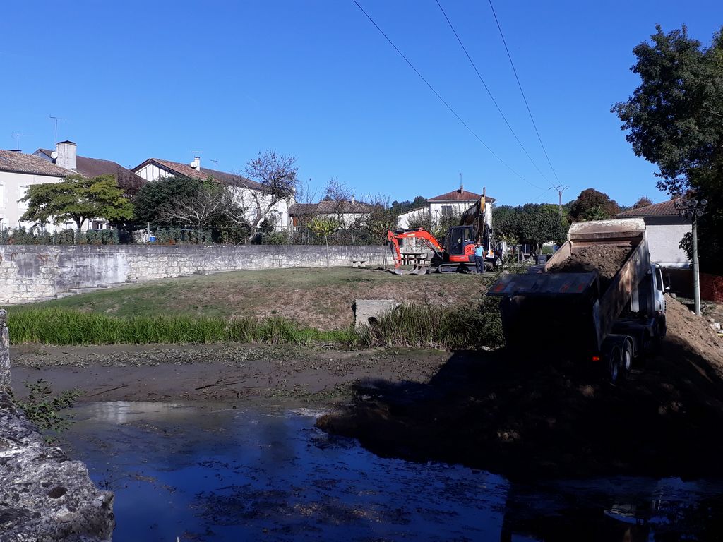 Pour accéder du mieux possible à l’édifice, un batardeau en terre vient d’être construit par l’Entreprise Estardier depuis la Place du Moulin nécessitant au préalable la création d’un chemin sur l’aire de pique-nique. La terre nécessaire à la construction du batardeau a été sortie côté amont des arches déjà restaurées. Cette décision aura permis également de dégager la vue sur cette partie romane du pont.