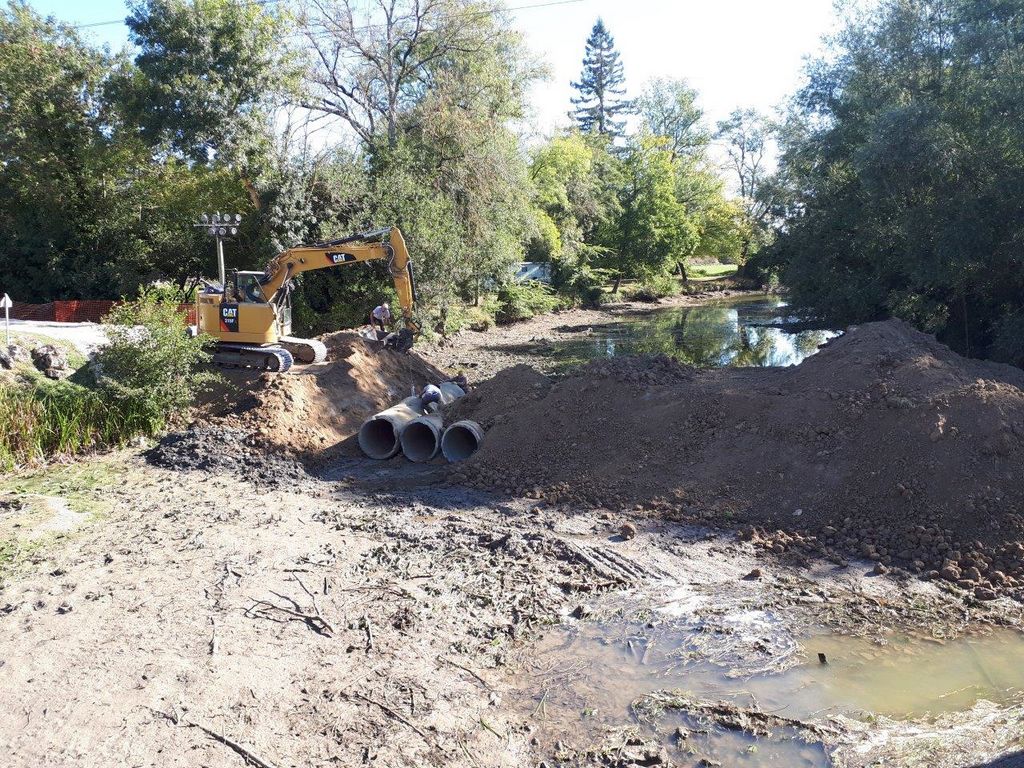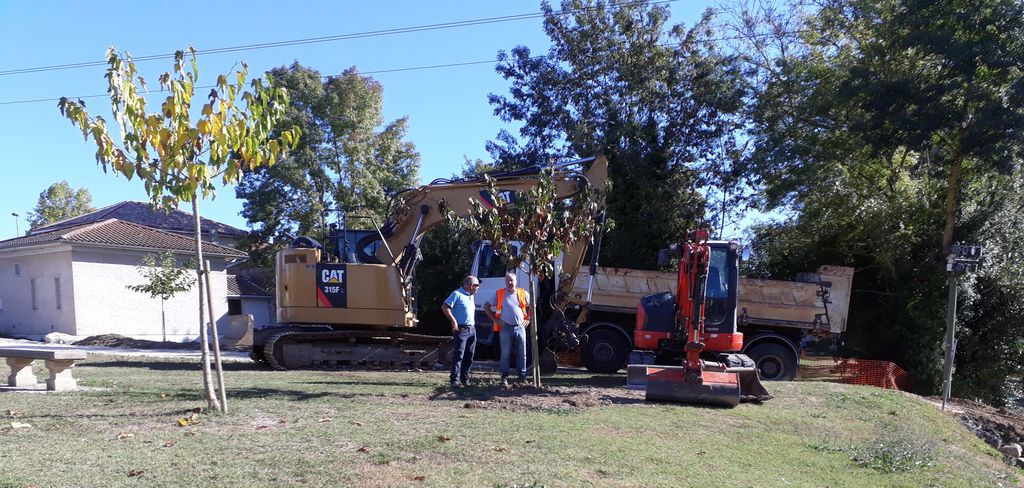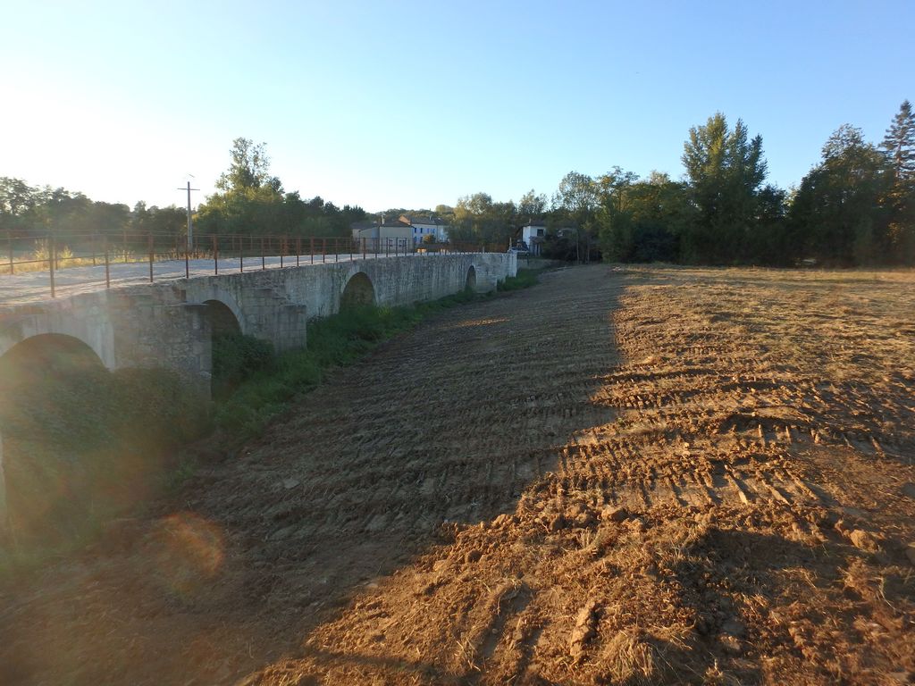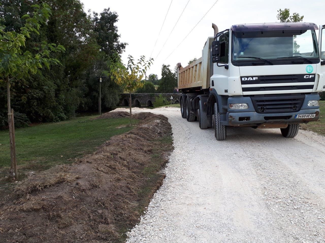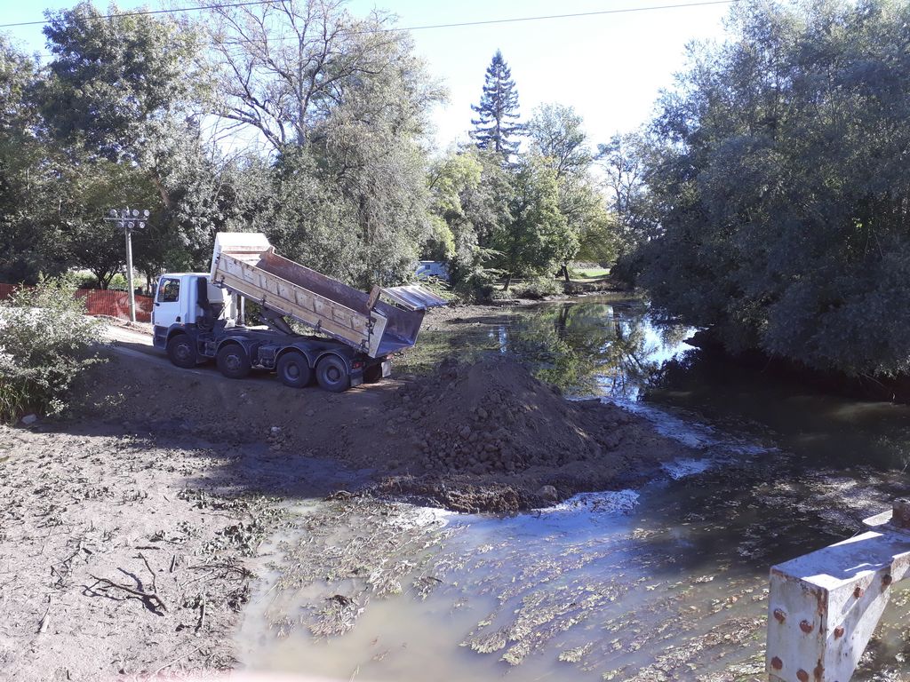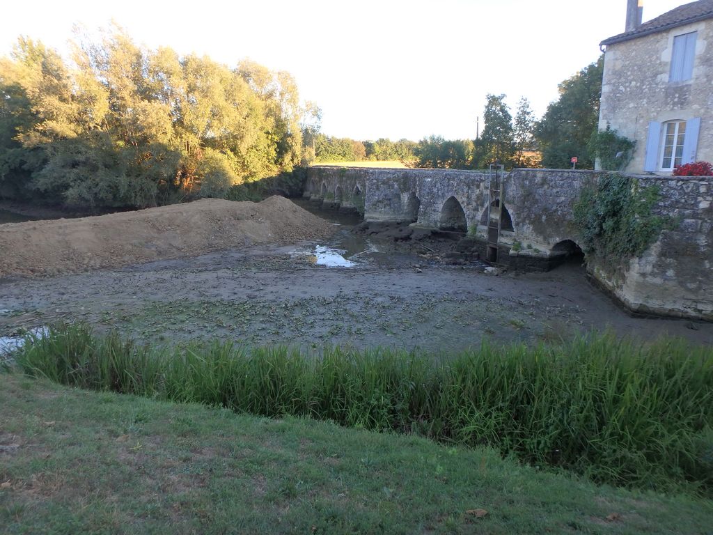 Pour accéder du mieux possible à l’édifice, un batardeau en terre vient d’être construit par l’Entreprise Estardier depuis la Place du Moulin nécessitant au préalable la création d’un chemin sur l’aire de pique-nique. La terre nécessaire à la construction du batardeau a été sortie côté amont des arches déjà restaurées. Cette décision aura permis également de dégager la vue sur cette partie romane du pont.