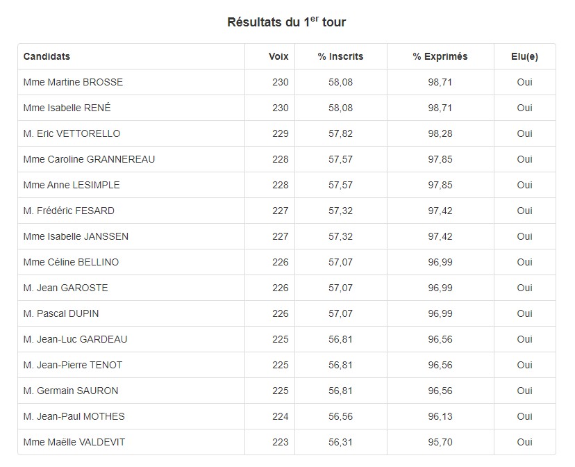 Les 15 sièges du conseil ayant déjà tous été attribués dès le premier tour, les élections municipales 2020 s’achèvent donc à La Sauvetat-du-Dropt (47). Les citoyens ont élu Martine Brosse et Isabelle René lors du 1er tour des élections municipales : ils arrivent en tête avec 98,71 % des voix. D’après les chiffres, fort de 98,28 % des suffrages, Eric Vettorello se révèle en troisième place. Caroline Grannereau (97,85 %), Anne Lesimple (97,85 %), Frédéric Fesard (97,42 %), Isabelle Janssen (97,42 %), Céline Bellino (96,99 %), Pascal Dupin (96,99 %), Jean Garoste (96,99 %), Jean-Luc Gardeau (96,56 %), Germain Sauron (96,56 %), Jean-Pierre Tenot (96,56 %), Jean-Paul Mothes (96,13 %) et Maëlle Valdevit (95,70 %) se distinguent également du fait de leur score élevé parmi les vainqueurs de ce tour.