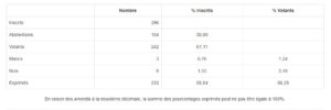 Un siège au conseil municipal est octroyé automatiquement à un candidat s’il a atteint le résultat qui suit : au moins 50 % des votes et plus du quart des suffrages des inscrits.