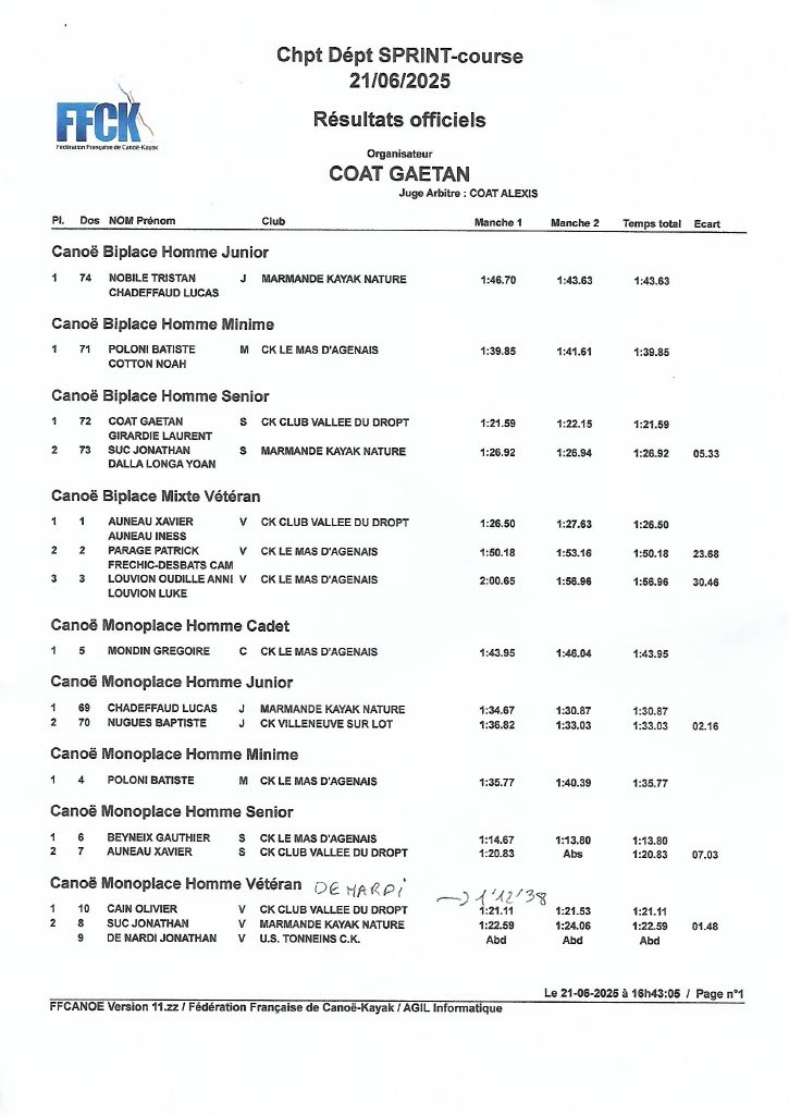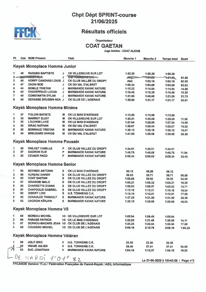 Kayak monoplace Homme Poussin : Camille Pailhet est champion du Lot-et-Garonne.