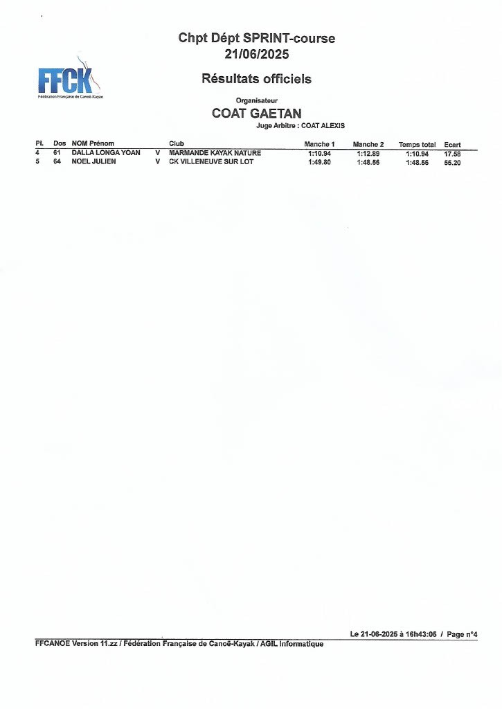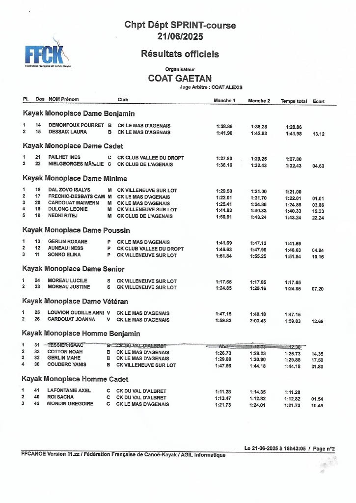 Kayak monoplace Homme Junior : Louis Korff Canovas est 2ème.