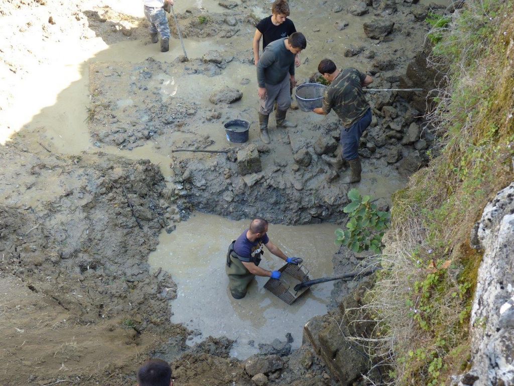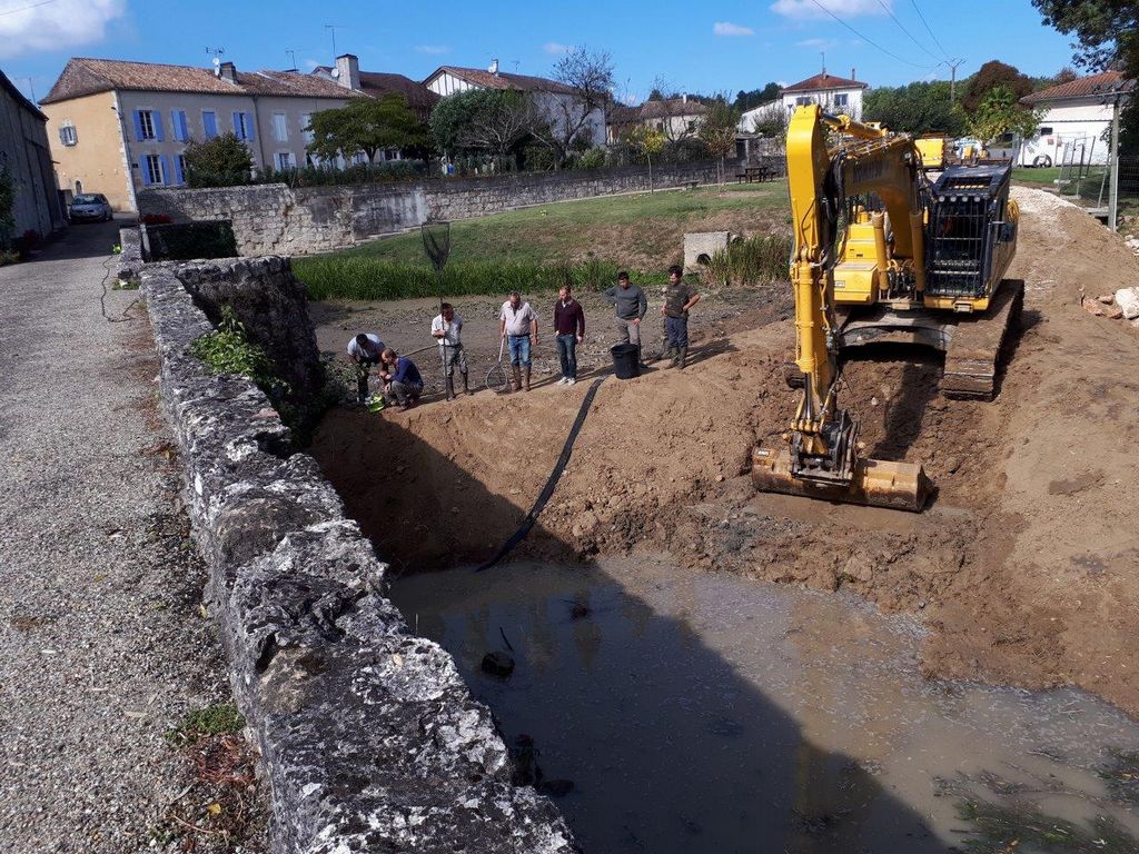 Suite à la construction du batardeau qui a permis d’assécher le Dropt au niveau du Pont Roman en prévision de la nouvelle tranche de travaux de restauration (voir l’article), la société de pêche départementale envoyait une équipe pour sauver les poissons éventuellement pris au piège du trou d’eau laissé volontairement par le conducteur de la pelle.