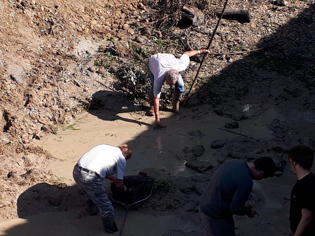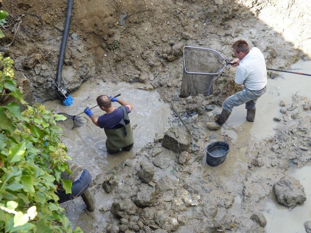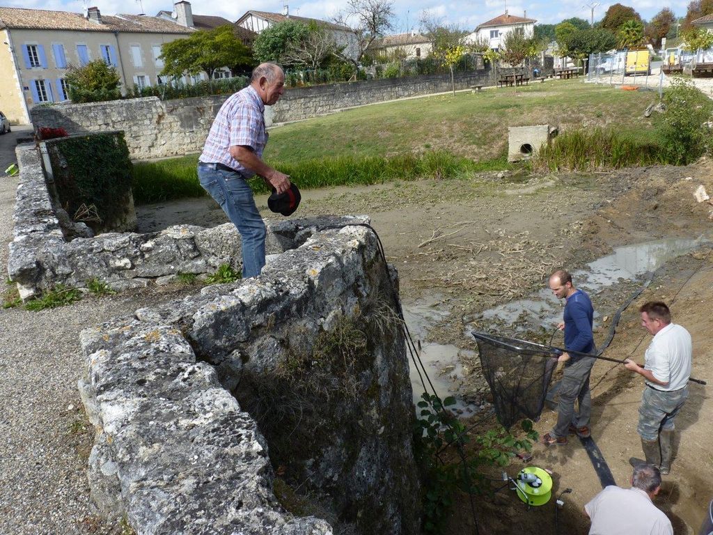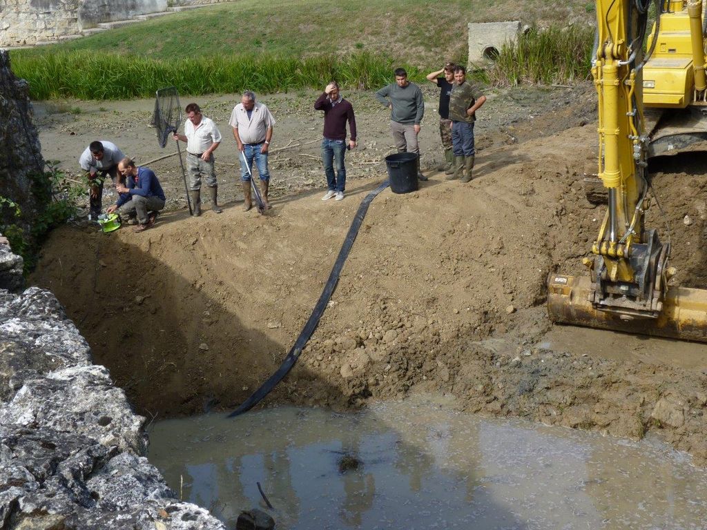 Il fallut dans un premier temps installer des pompes utilisées pour envoyer l’eau de l’autre côté du pont. Opération un peu longue en raison d’un amorçage difficile. Puis, à l’aide d’épuisettes, sortir les poissons prisonniers. La pêche ne fut pas miraculeuse mais permit de remettre à l’eau quelques écrevisses, deux poissons d’une dizaine de centimètres, plusieurs de moins de 2 cm, une belle anguille et trois plus petites.