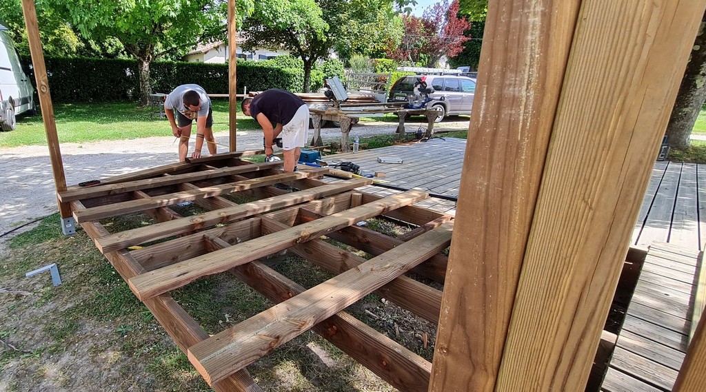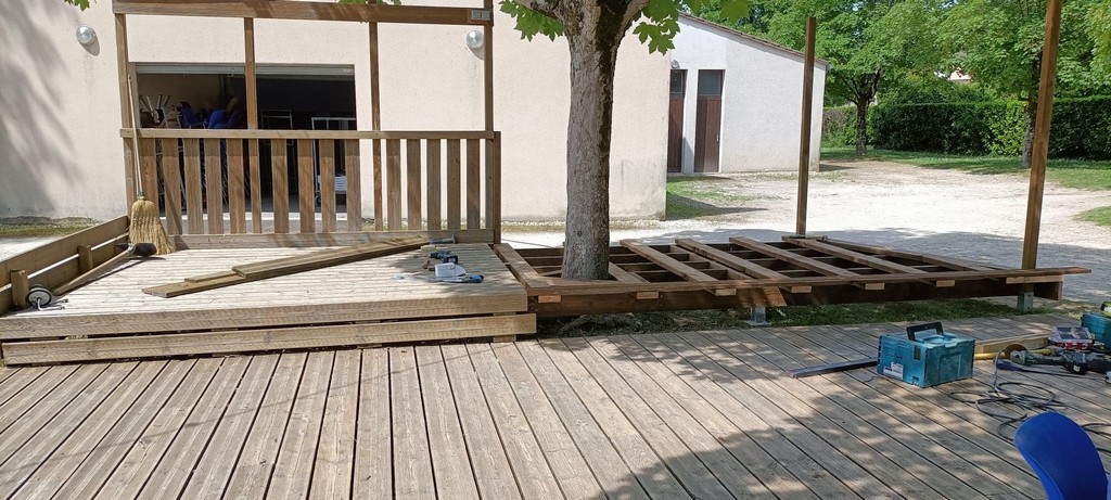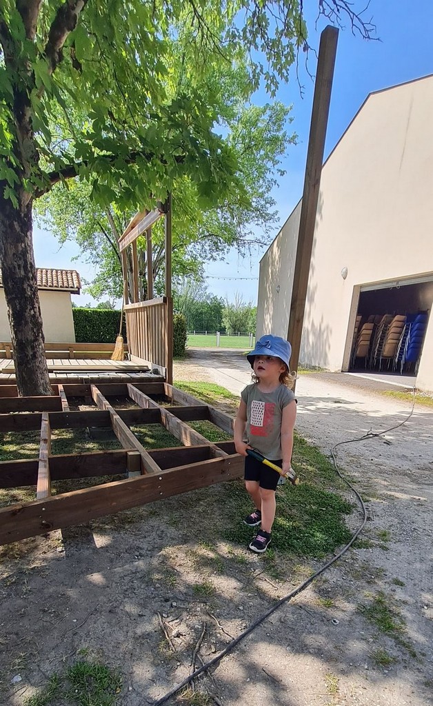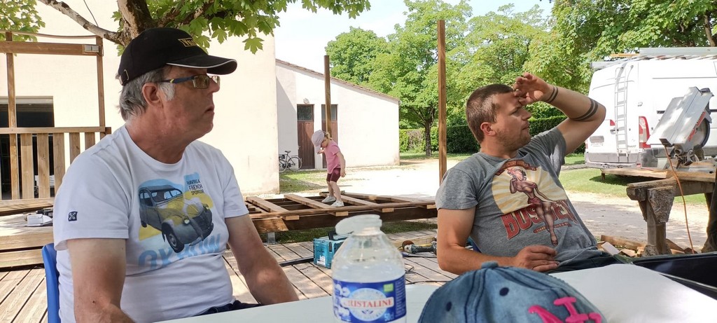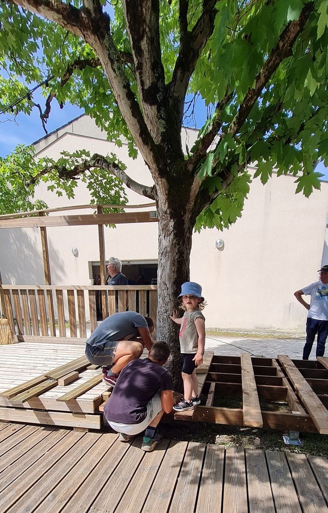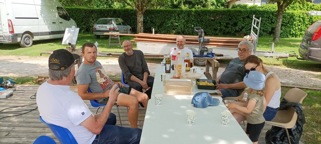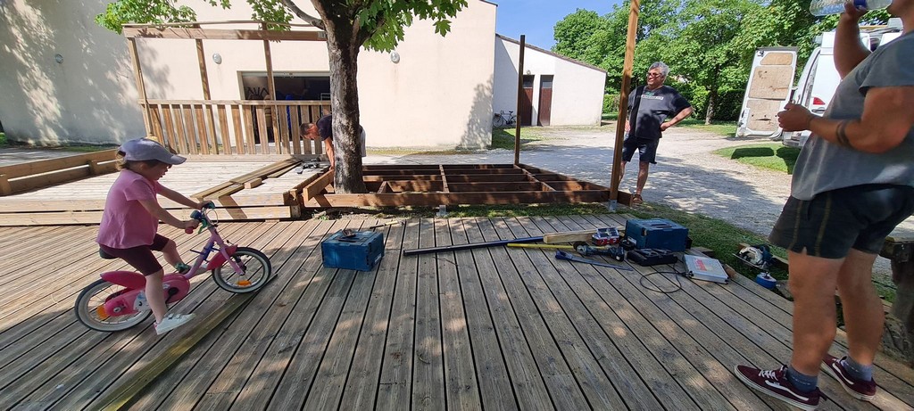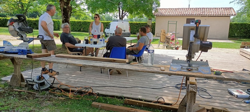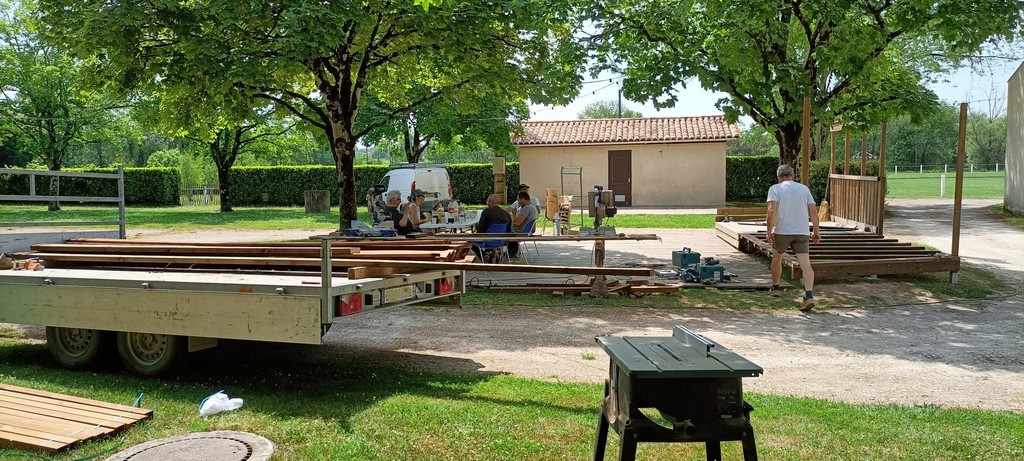 Suite à l’Assemblée Générale de début mai, les bénévoles du Comité des Fêtes, les jeunes, et même très jeunes, ont sorti leurs outils pour rallonger la scène de la Prairie des Croquants. Une évidence, de l’avis du président Peter Cain et de son second Alain Crossoir. Les musiciens des groupes accueillis sont souvent nombreux et avaient jusque là du mal à se caser, eux et leur matériel de sonorisation. Une initiative que n’a pas manqué de saluer Aurélien, employé municipal du village, qui viendra, comme chaque année, avec son groupe de rap Les As du Mic.