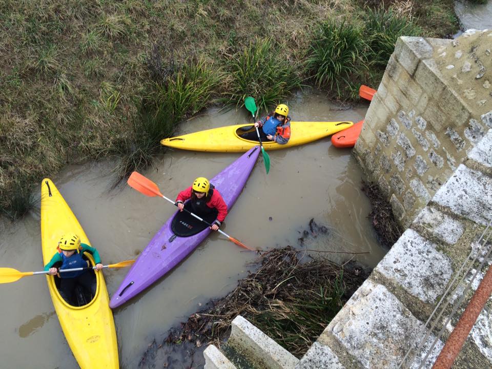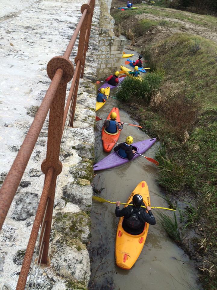 Les jeunes kayakistes du CKC Vallée du Dropt, heureux de la montée des eaux, font du slalom entre les arches du pont médiéval.