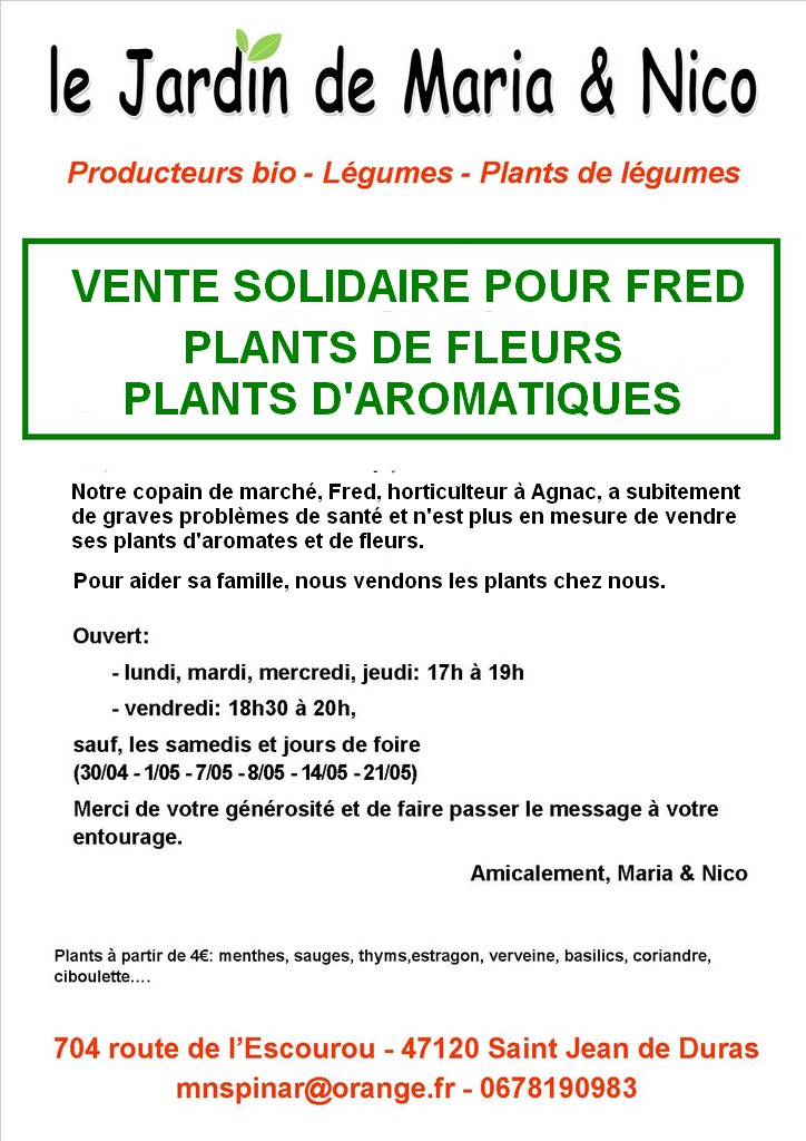 Coordonnées du couple de maraîchers qui organisent cette vente par solidarité. A contacter si Marianne n’est pas disponible : Le Jardin de Maria et Nico – 704 Route de l’Escourou – 47120 St Jean de Duras – mnspinar@orange.fr et 06 78 19 09 83.