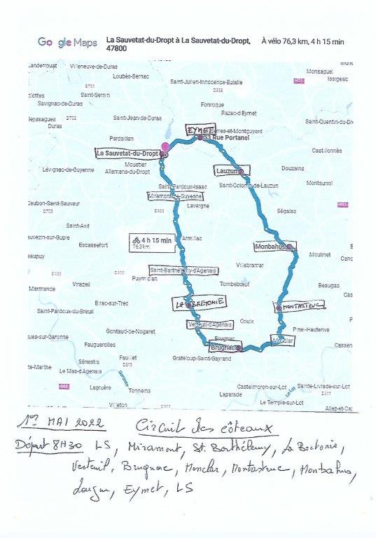Côté circuit, nous avons voulu quitter la Vallée du Dropt pour faire découvrir aux nouveaux adhérents de l’USS Cyclo, eux qui pensaient aménager dans une région de plaine, les contreforts chers à notre ami Germain, du côté de Monclar, Montastruc, Monbahus, Lauzun …