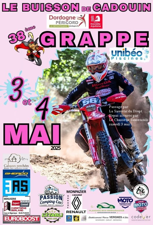 La fête est finie, chacun a pu regagner ses pénates après ce rendez-vous gourmand convivial. Quant aux chasseurs, la remise en place de la salle les aura occupés jusqu’au lundi. Mais rien ne les arrête ! La preuve, c’est qu’ils seront chargés des repas des pilotes de la Grappe de Cyrano qui aura lieu les 3 et 4 mai prochain. 600 pilotes pour cet enduro touristique et sportif et tout leur staff sur un parcours de 400 kms en deux jours qui débute au Buisson de Cadouin et qui passera par notre village de La Sauvetat du Dropt le samedi 3. L’occasion pour nos chasseurs de garnir leurs barbecues de grillades.