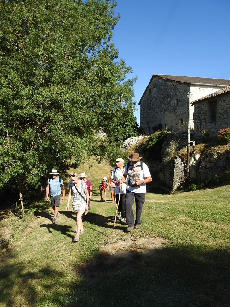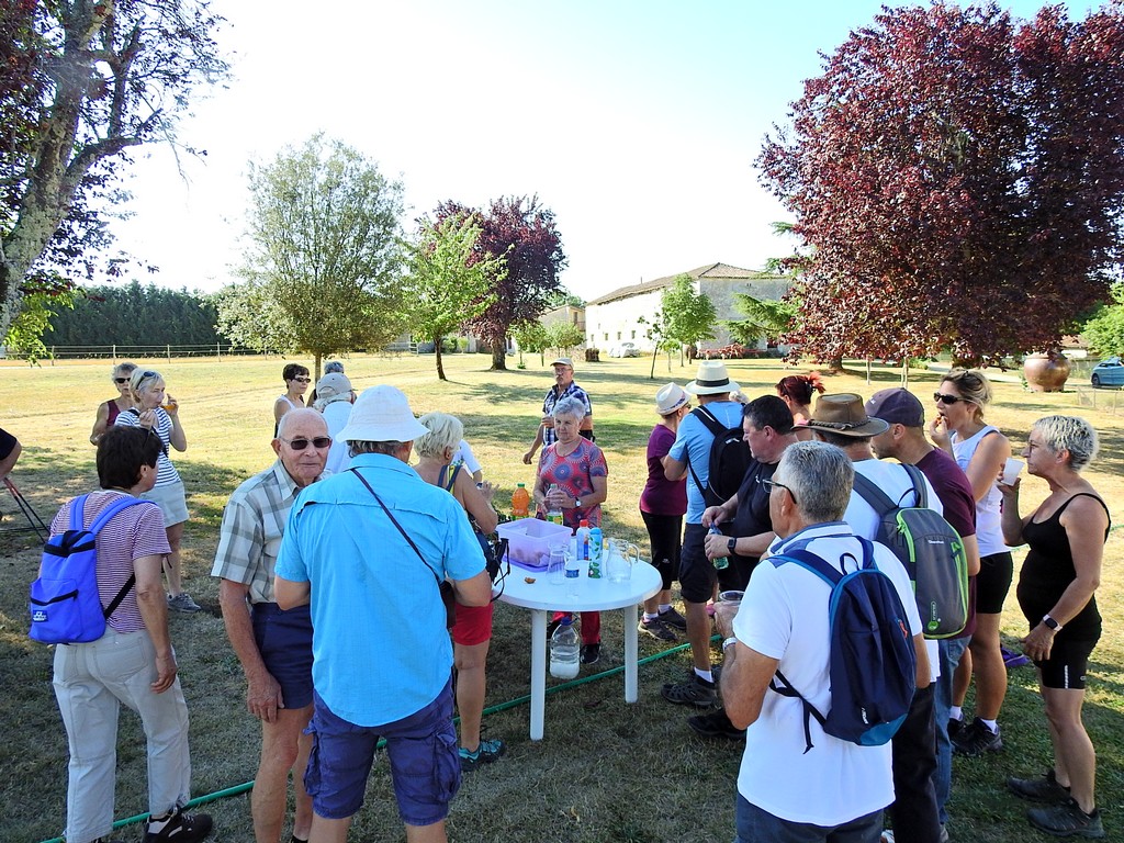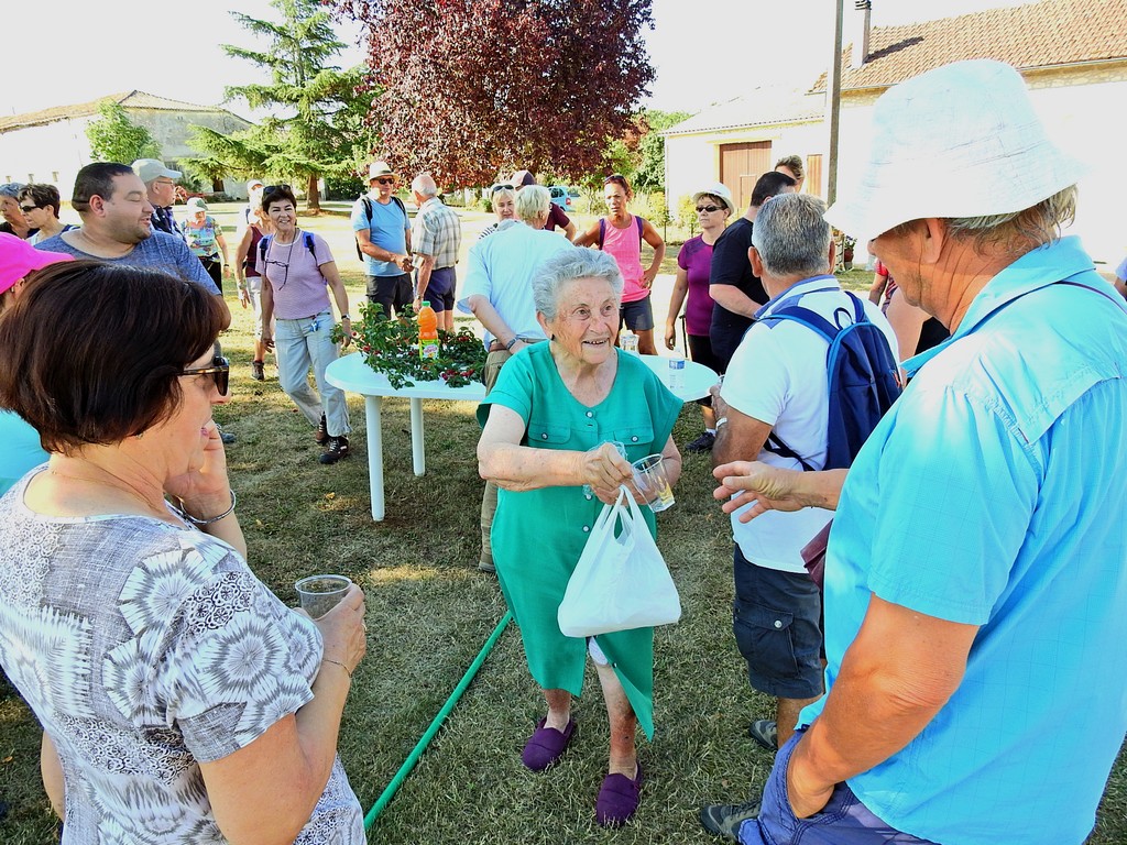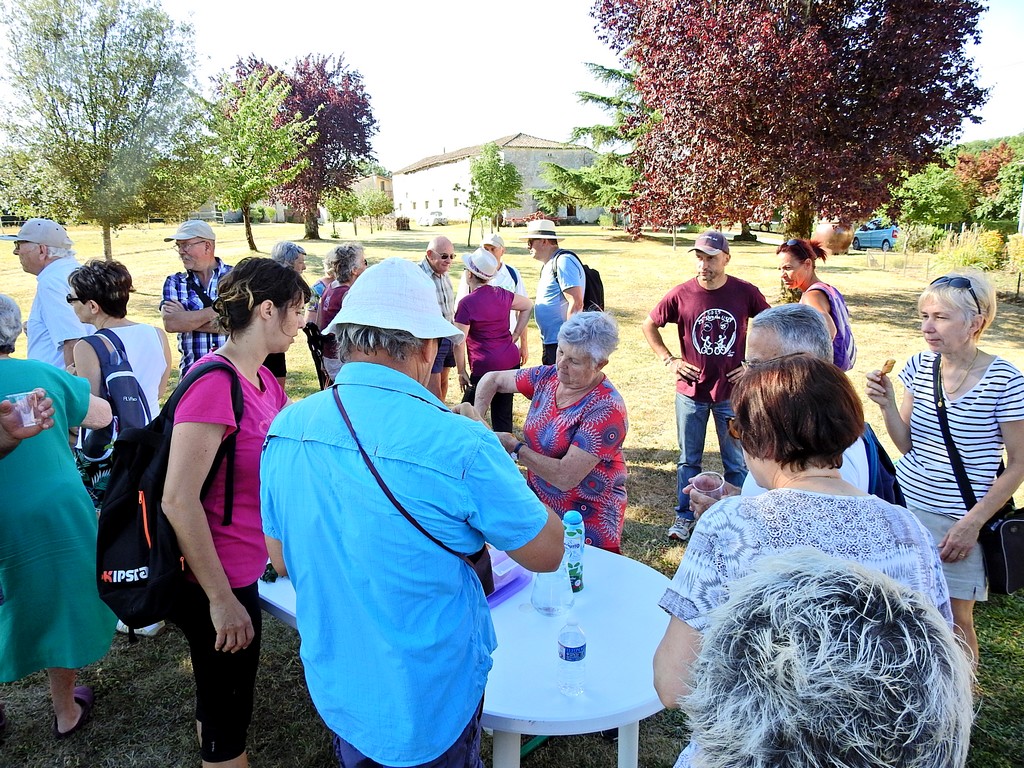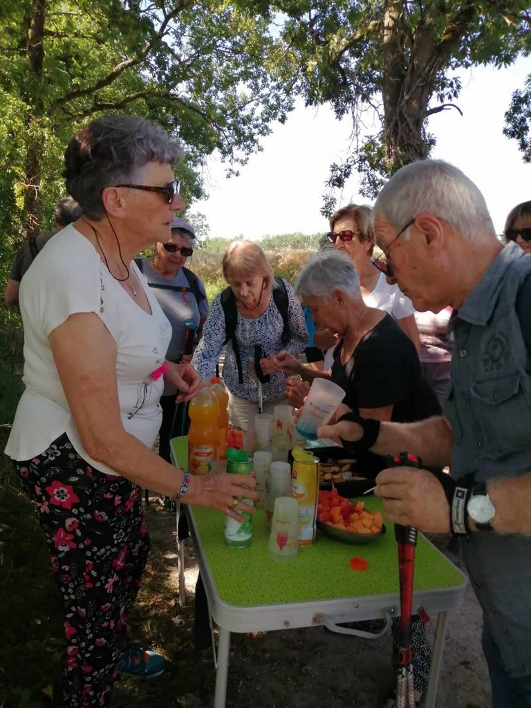 Le parcours revenait à La Sauvetat via Le Couloma avant de s’engager entre des carrés de vignes nous menant à St Germain en passant devant le puits Gavache qu’il serait intéressant de nettoyer pour en expliquer son origine. Puis, nous remontions vers le hameau de Serres, sur la commune de Soumensac où nous attendaient le président et Francine pour une collation devant la porte de Marie-Jeanne et Robert Arzile. Un rendez-vous incontournable pour ce couple de nonagénaire qui ne manque pas de visiter notre village à l’occasion des thés dansants ou des repas de saison. Après avoir fait les 3/4 du parcours, les merveilles de Francine accompagnées de melons et de pastèques rafraichissaient les vaillants marcheurs.