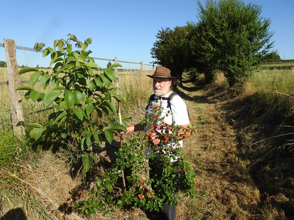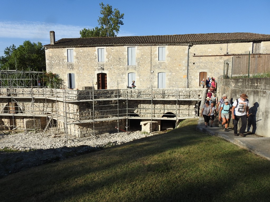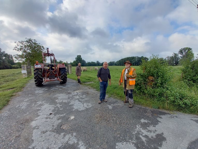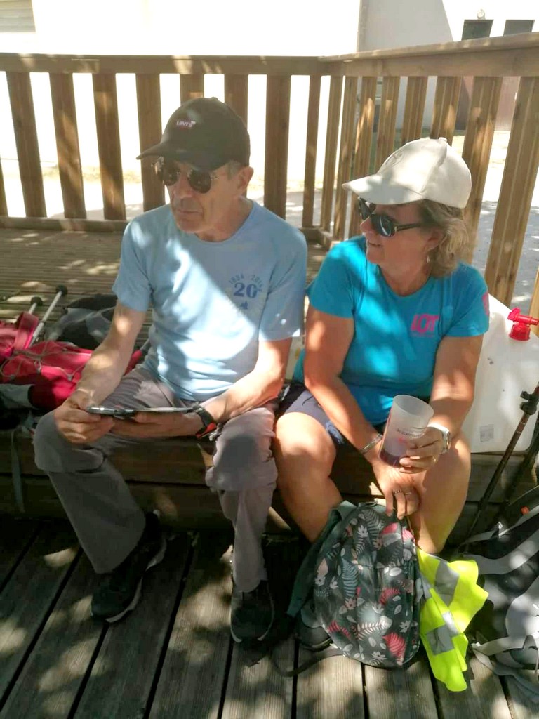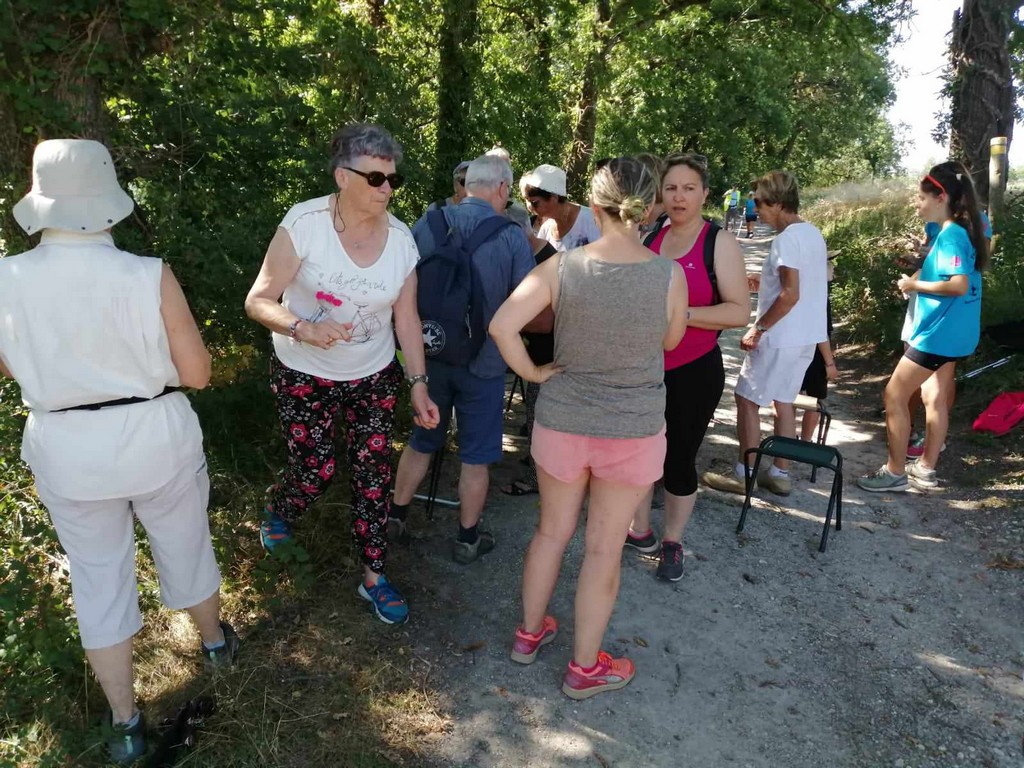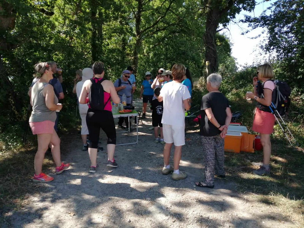 Le parcours revenait à La Sauvetat via Le Couloma avant de s’engager entre des carrés de vignes nous menant à St Germain en passant devant le puits Gavache qu’il serait intéressant de nettoyer pour en expliquer son origine. Puis, nous remontions vers le hameau de Serres, sur la commune de Soumensac où nous attendaient le président et Francine pour une collation devant la porte de Marie-Jeanne et Robert Arzile. Un rendez-vous incontournable pour ce couple de nonagénaire qui ne manque pas de visiter notre village à l’occasion des thés dansants ou des repas de saison. Après avoir fait les 3/4 du parcours, les merveilles de Francine accompagnées de melons et de pastèques rafraichissaient les vaillants marcheurs.