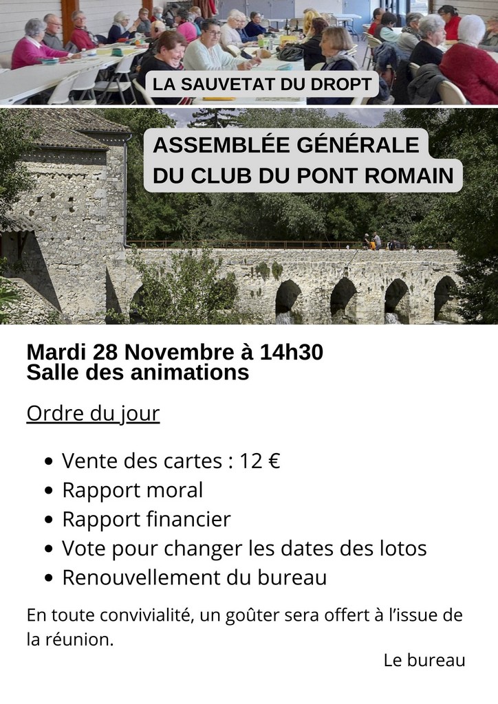 André Dubernard, président de l’association des Amis de la Sauveté, vous convie à l’Assemblée Générale qui aura lieu dans la Maison des Loisirs le samedi 25 janvier à 18h30.