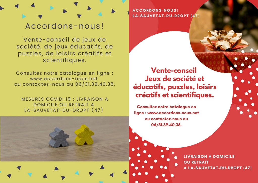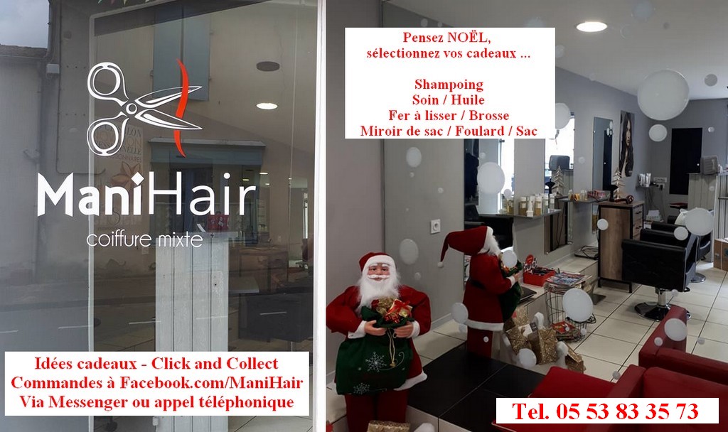 L’entreprise de Jeux-jouets Accordons-nous s’adapte aux conditions de re-confinement. Profitez-en pour penser aux cadeaux de Noël. Vous choisissez en ligne et vous passez commande. Le choix est large. Pour les commandes à partir de 30€, en raison du re-confinement, les livraisons sont gratuites dans un rayon de +/- 30 km de La-Sauvetat-du-Dropt (47). Idem pour le Salon de Coiffure ManiHair qui propose une large gamme de produits de beauté pour les cheveux ainsi que des accessoires de mode.