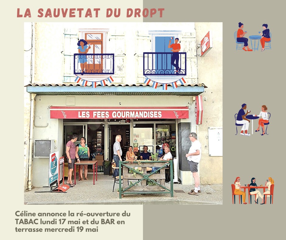 Les mesures gouvernementales autorisant la réouverture des terrasses, Céline, du Bar-Tabac-Restaurant Les Fées Gourmandises annonce la reprise du bureau de tabac, lundi 17 mai et celle du bar, mercredi 19 mai, en terrasse uniquement. Enfin un peu plus d’animation et de convivialité dans la Rue de Grammont !