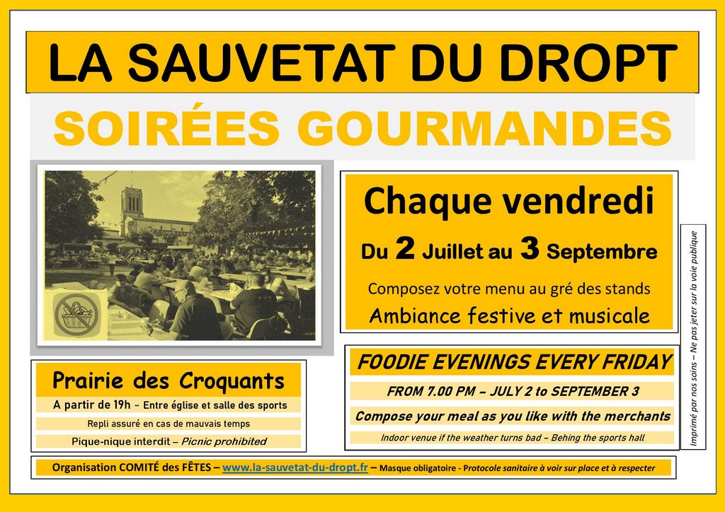 Les Soirées Gourmandes ont lieu chaque vendredi de l’été, du 2 juillet au 3 septembre 2021, sur La Prairie des Croquants dans notre charmant petit village de La Sauvetat du Dropt.
