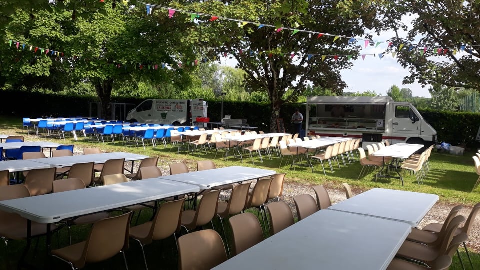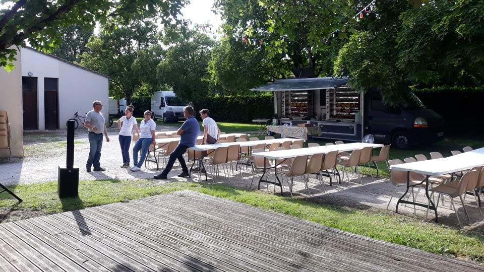 Photos de l’installation des tables pour la 1ère des Soirées Gourmandes cru 2021 de Stéphane Bottin, bénévole très actif du Comité des Fêtes et photos de la seconde des soirées du 9 juillet 😉