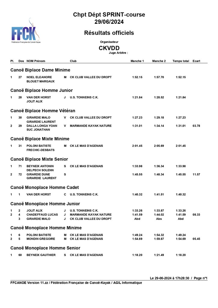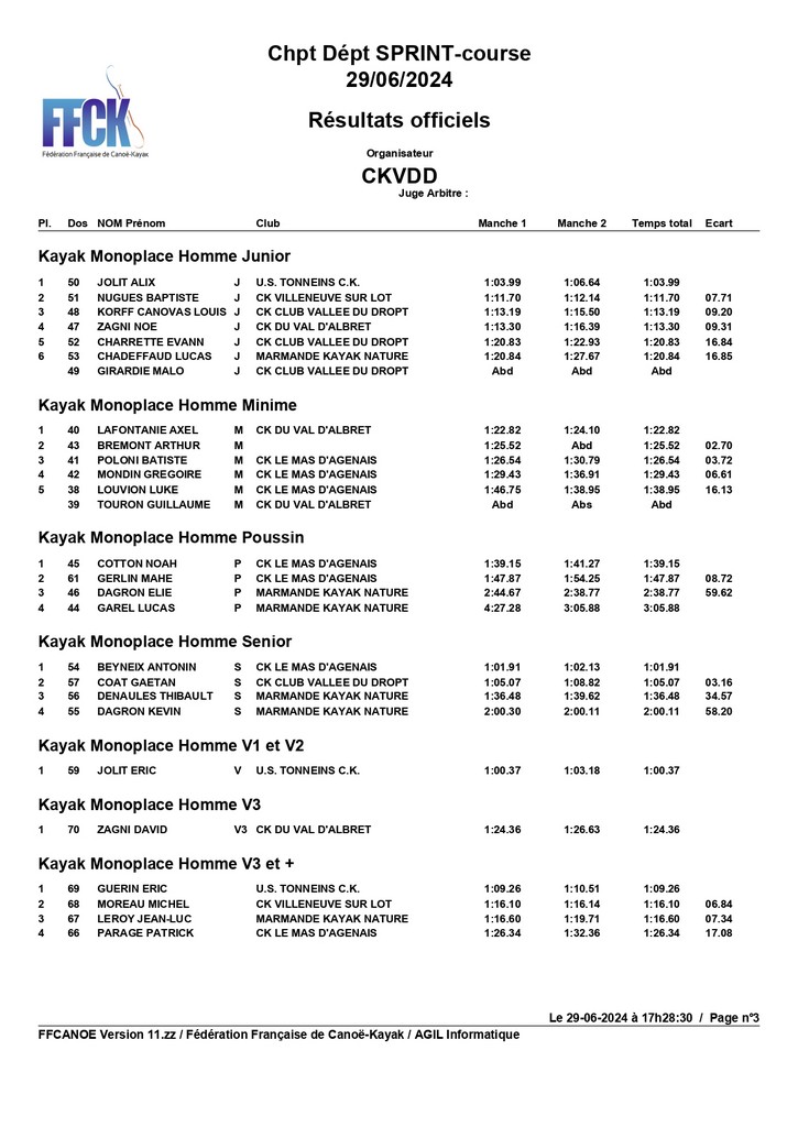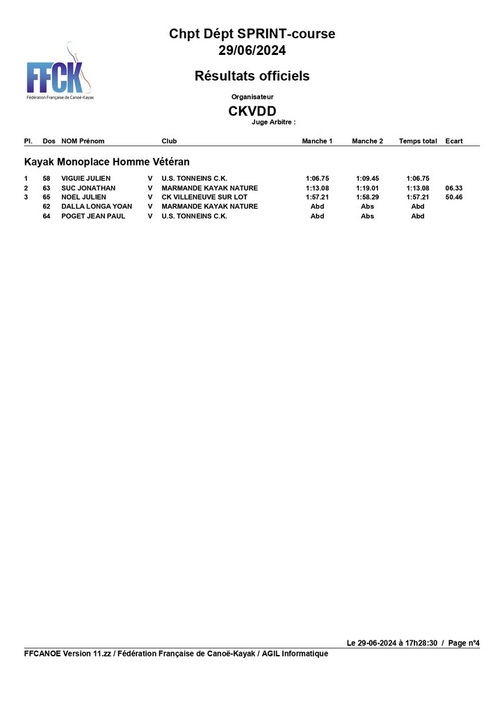 Canoë Monoplace Homme Veteran : Olivier Cain est 2ème.Bravo à tous. Merci pour votre présence.
