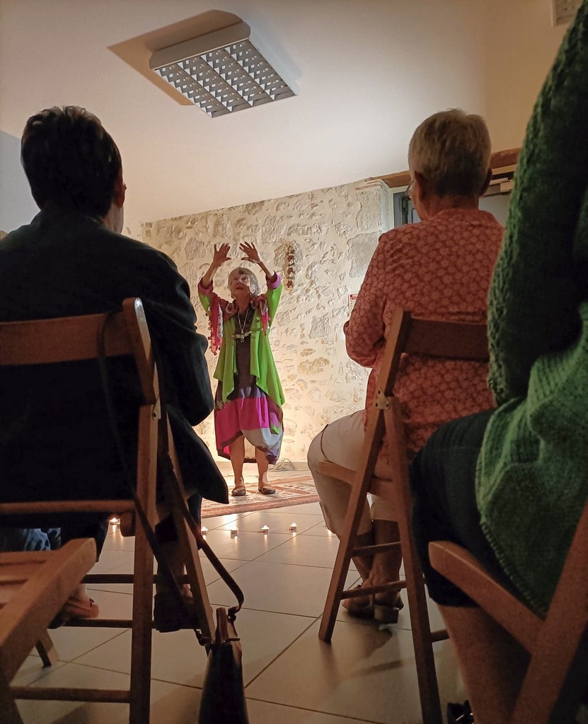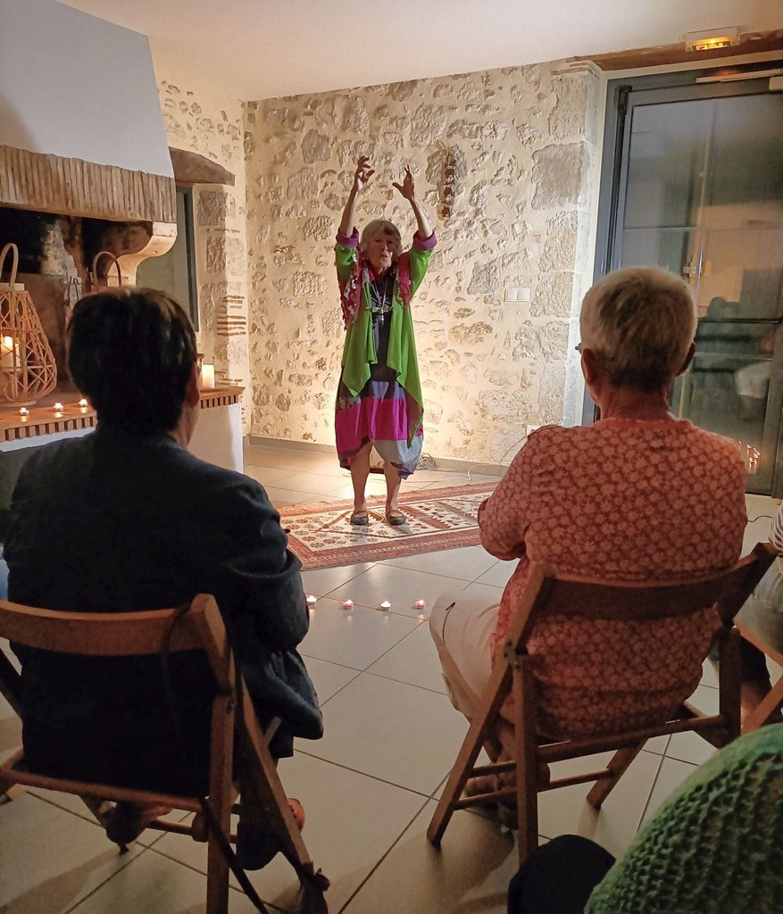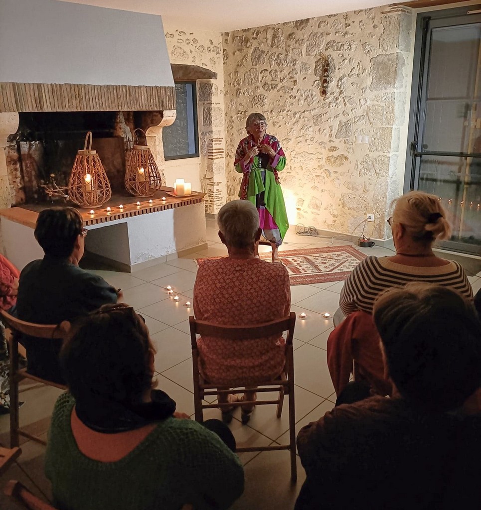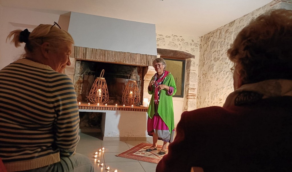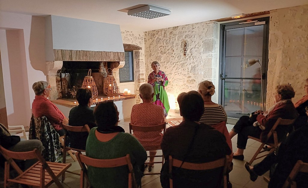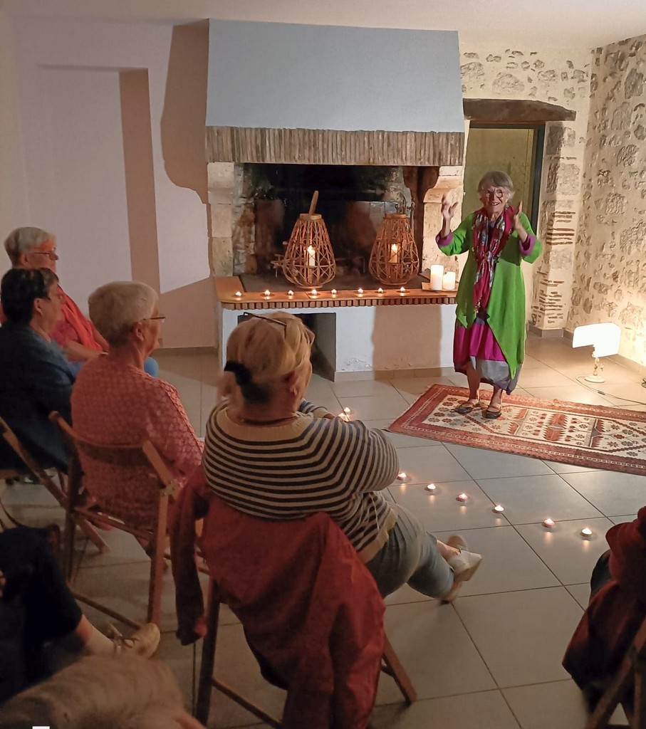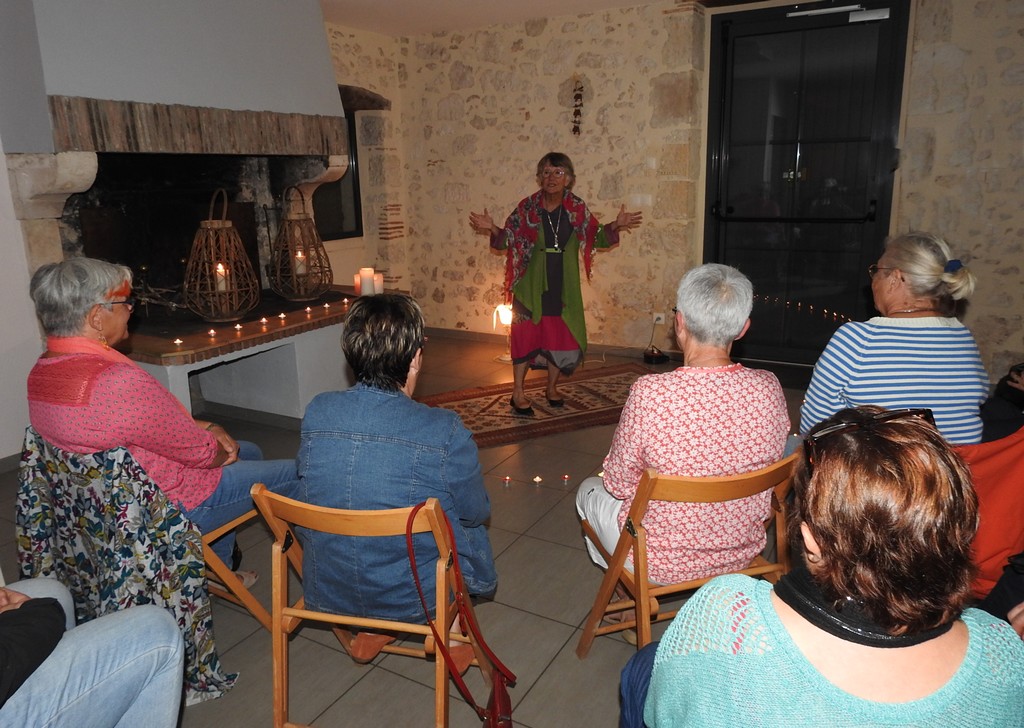 Les présentations étant faîtes, Chantal Constant, tenue colorée, cernée de la chaude lumière de bougies pour rajouter du mystère aux récits, déroulait des contes tous plus captivants les uns que les autres. Des contes sur la folie d’aimer qui emmenaient le public dans des paysages de savane, près de cases où l’on pile le mil … La parole est fluide et les gestes harmonieux. Chantal captive l’auditoire qui opine du chef pour approuver ou qui s’indigne et se rebelle de ces histoires merveilleuses qui, finalement, racontent la vie.