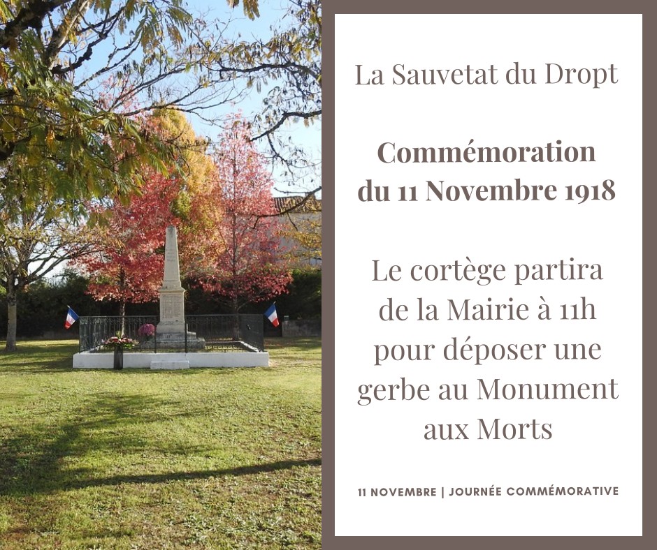 La Municipalité de La Sauvetat du Dropt vous invite à joindre le cortège qui partira de la Mairie à 11h pour déposer une gerbe aux monuments aux morts.
