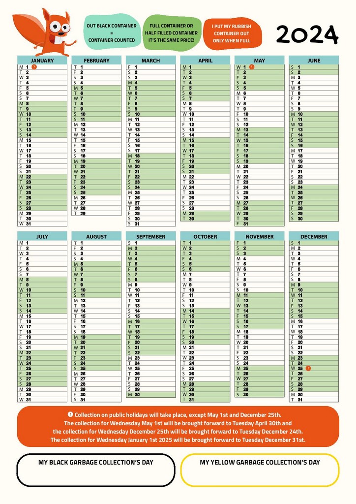 On this Collection Calendar 2024, lots of information is given to help you with selective sorting. Information also about the collection on the public holidays :