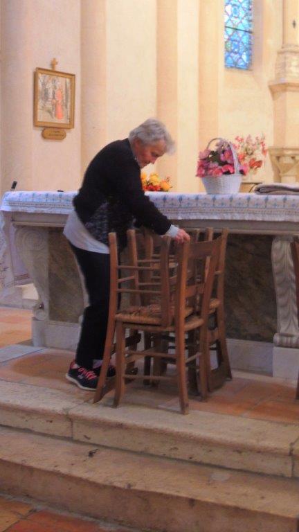 L’église du village ayant besoin de se faire une beauté avant la fête votive du 7 août une équipe, non pas de bras cassés mais enthousiaste, a passé l’après-midi du lundi à cette tâche, même le petit-fils de Marcelle a participé.